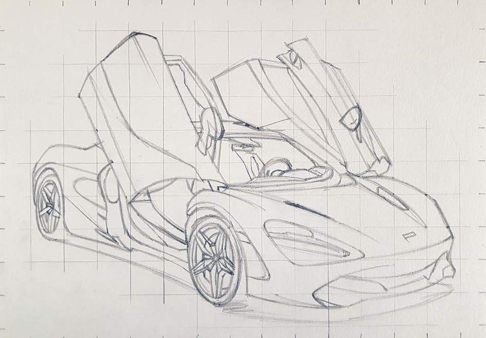 The McLaren we're drawing has the doors up, which looks really cool, but it also shows some parts of the door sills and the interior, which we're going to draw next.