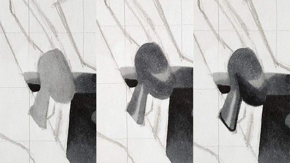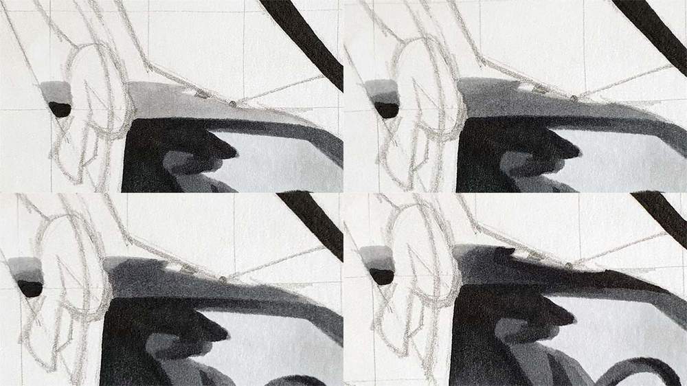 After that, I layered Neutral Grey 07 (CG070) on the bottom right and blended that into the Neutral Grey 03 (CG030) on the bottom left. I also added Neutral Grey 07 (CG070) line on the top left and on the outside of the reflection in the middle.
