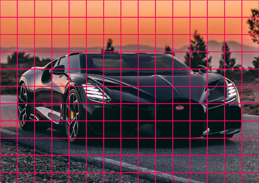 To create the drawing of the Bugatti Mistral, I used 3 reference photos: 1 for the perspective and the proportions, 1 for the lighting and the reflections, and 1 for the color.