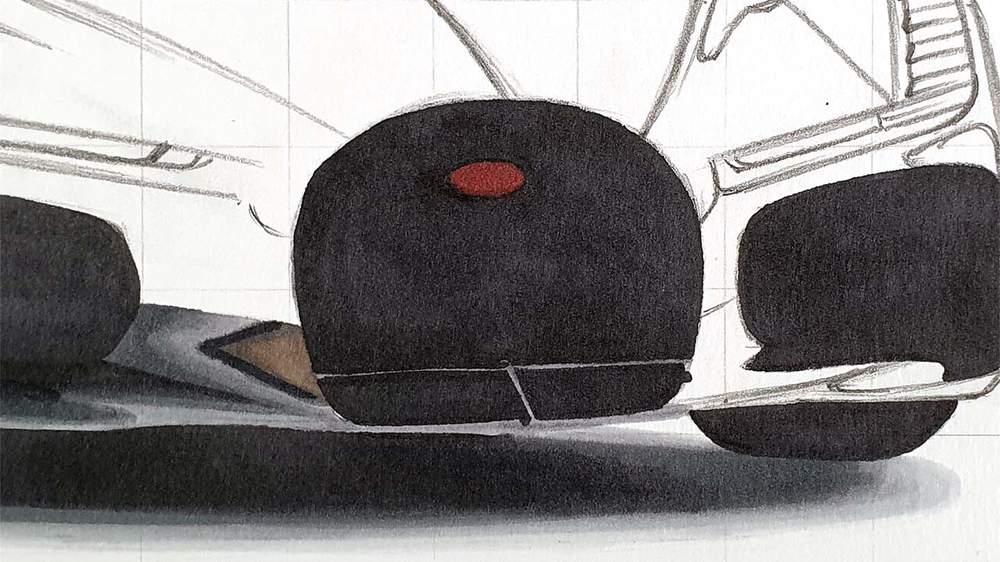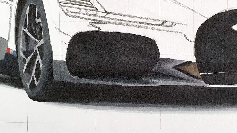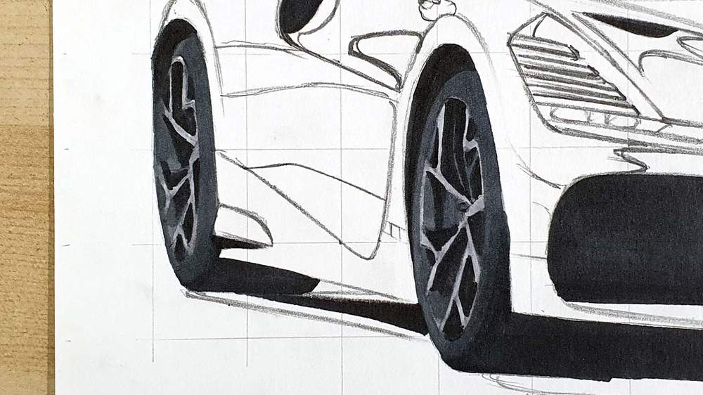 Next, I start coloring. First, the pure black parts to make the drawing look less overwhelming, and then the rest of the car.