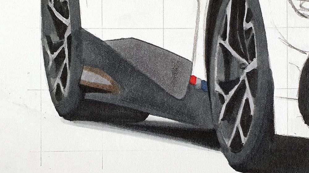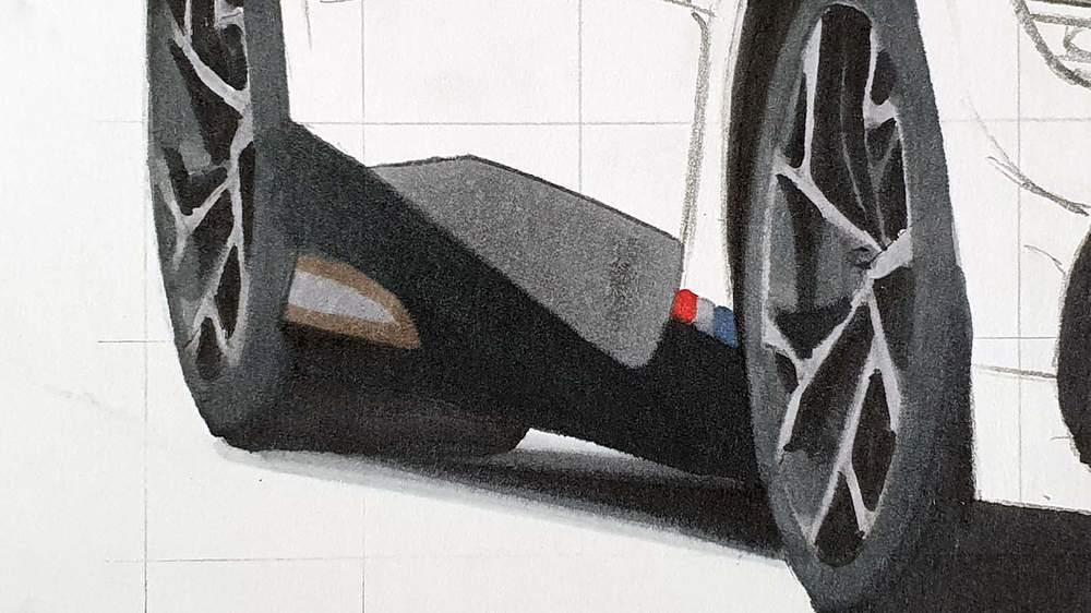 Next up, I used Black, Dove Grey, and White Derwent Coloursoft colored pencils to add details to the car.