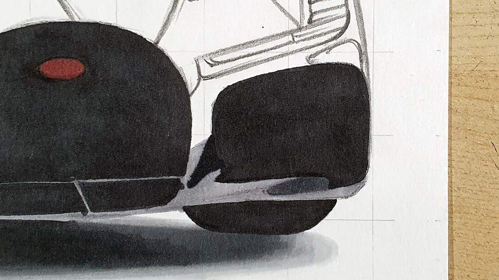Next, I blended the dark grey reflection below the grill into the black with Blue Black and Ice Grey 7. I also added a Blue Black outline to the Warm Grey reflection on the right and I transitioned the light part around that into Ice Grey 4 and then Ice Grey 7.