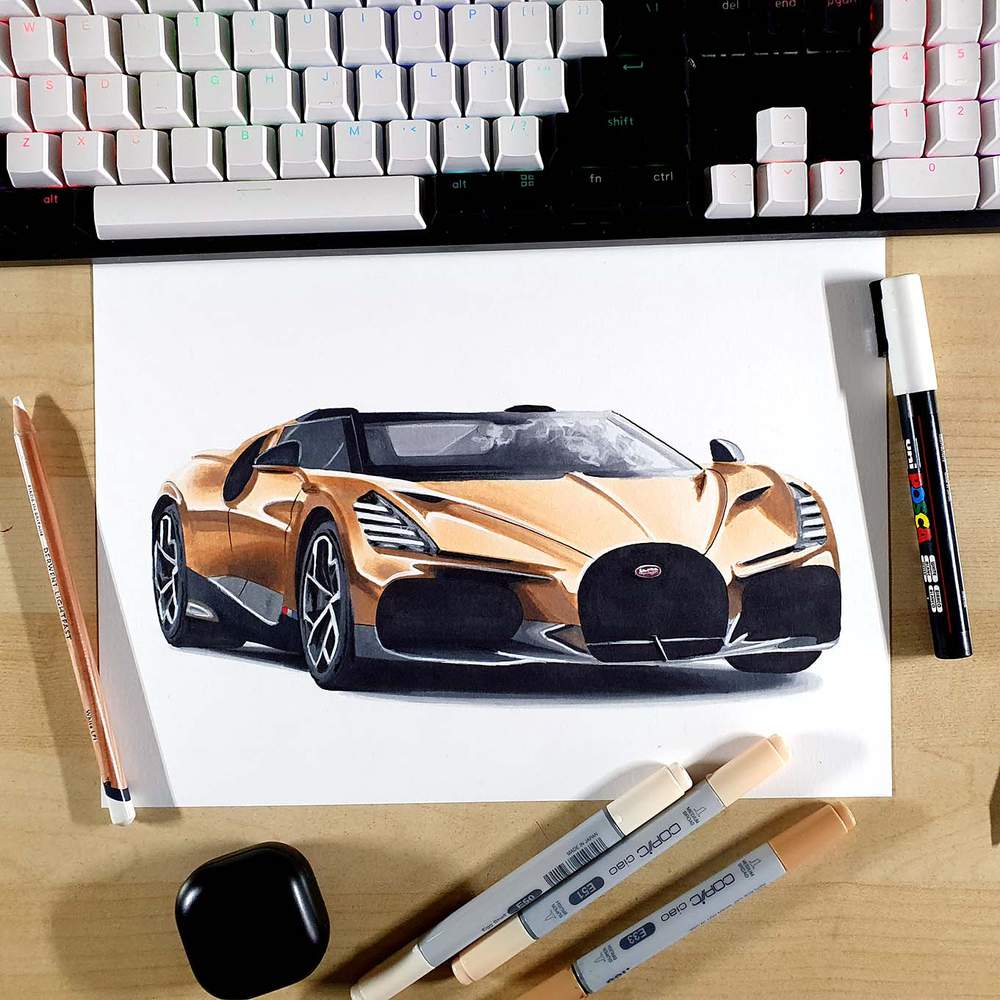 When I draw a car like a Bugatti I first find a couple of reference photos I'm going to use. After that, I start sketching the outline of the car. I make sure the sketch is as good and accurate as possible before I move on to coloring.