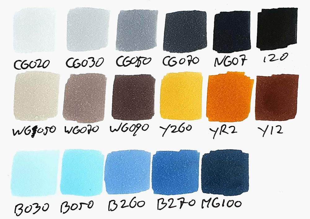 Ohuhu Honolulu markers in the colors Neutral Grey 02 (CG020), Neutral Grey 03 (CG030), Neutral Grey 05 (CG050), Neutral Grey 07 (CG070), Neutral Grey 7 (NG07), Black (120), Warm Grey 05 (WG050), Warm Grey 07 (WG070), Warm Grey 09 (WG090), Yellow Dahlia (Y260), Marigold (YR2), Mahogany (Y12), Frost Blue (B030), Robin's Egg Blue (B050), Smoky Blue (B260), Vivid Blue (B270), and Blue Grey 09 (MG100). (Also available individually here.);