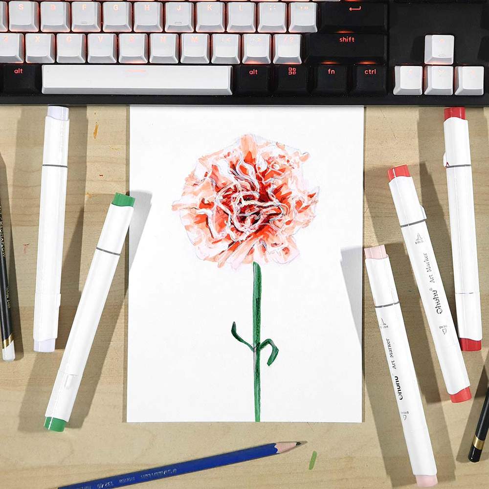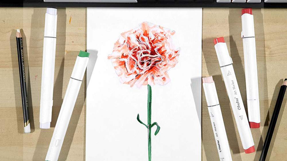 To make this carnation drawing, I used a combination of alcohol markers and colored pencils.