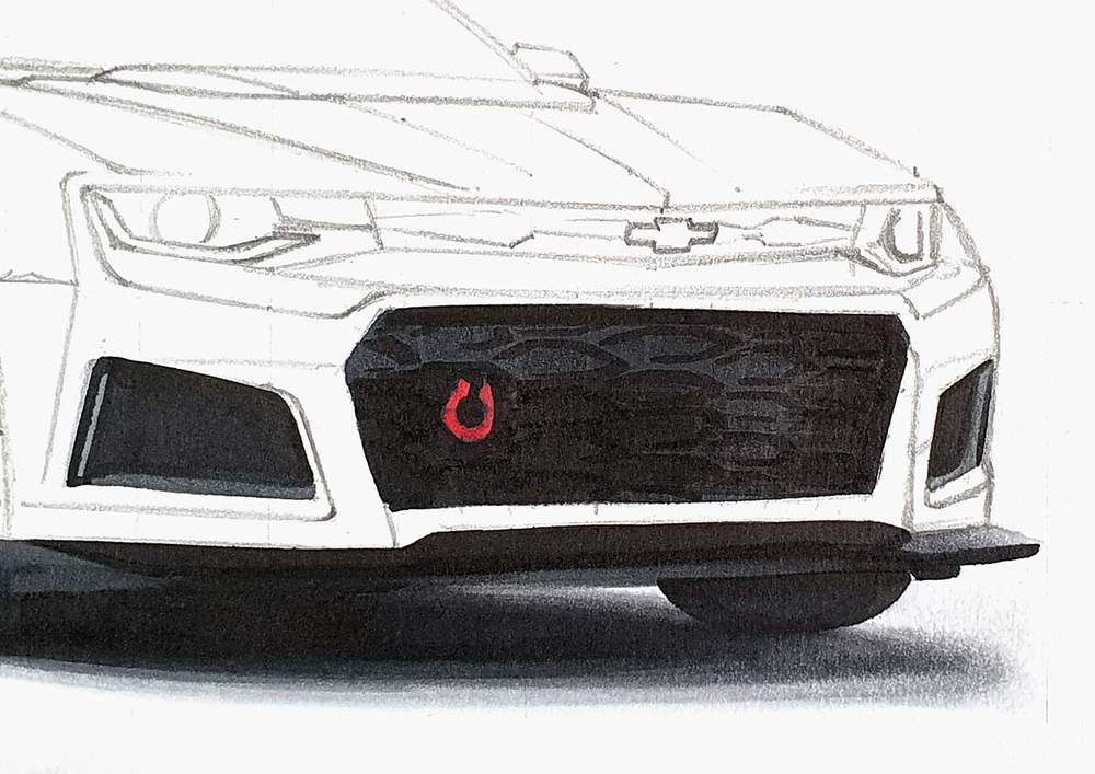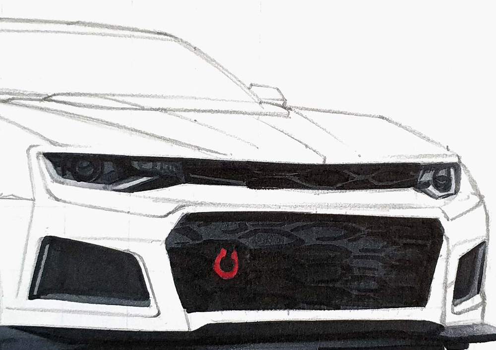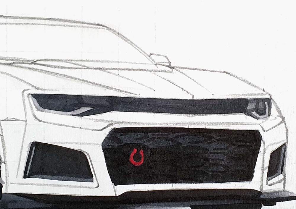 Usually, I also color the whole grill black to avoid drawing all the details, but with this Camaro, I wanted to actually draw the details of the grill.