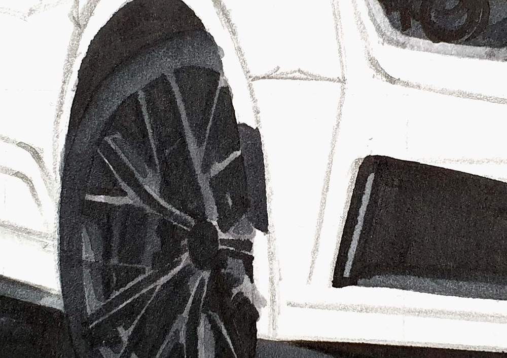 I used the white pencil to highlight panel edges and the spokes of the wheels, and to add details and highlights to the headlights and the logo.
