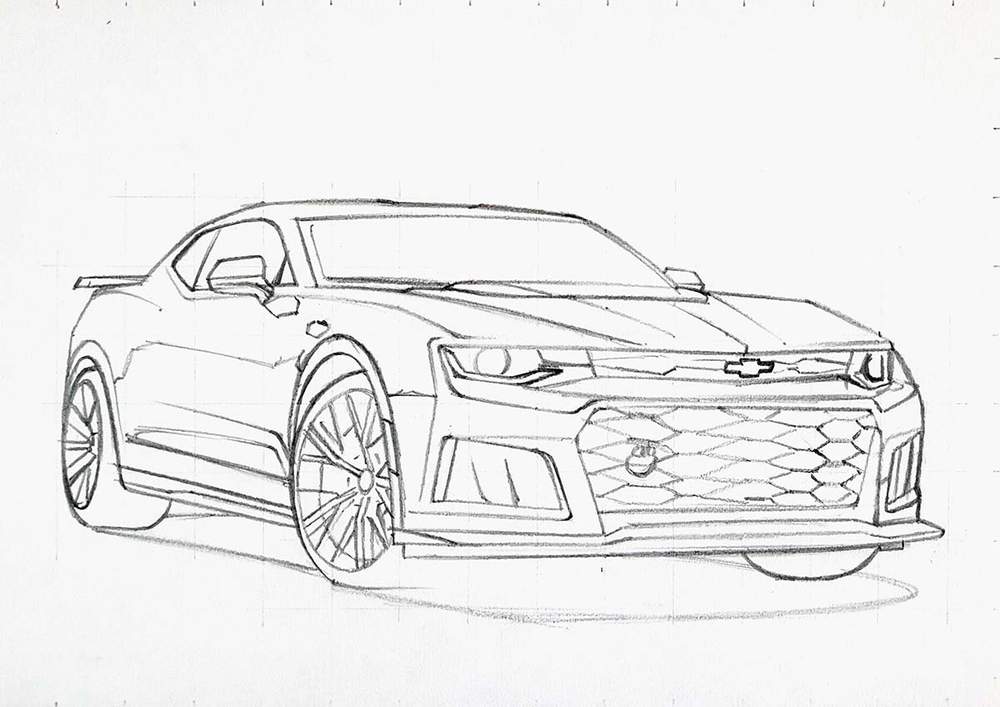 After that, I lightened the grid with an eraser and started sketching the outline of the Camaro ZL1.
