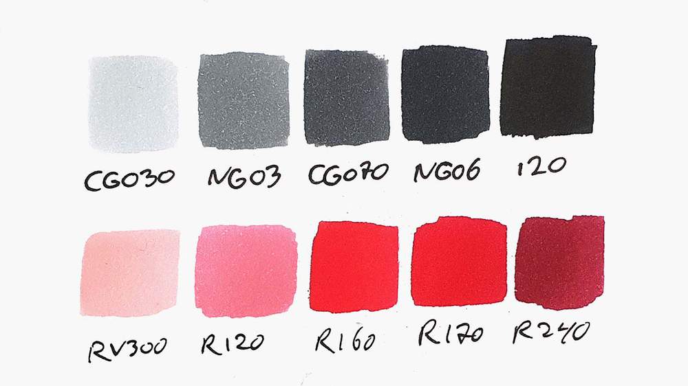 To make this drawing, I used Ohuhu Honolulu markers in the colors Colorless Blender (0), Neutral Grey 03 (CG030), Neutral Grey 3 (NG03), Neutral Grey 07 (CG070), Neutral Grey 6 (NG06), Black (120), Tender Pink (RV300), Light Prawn (R120), Cadmium Red (R160), Lipstick Red (R170), and Garnet (R240).
