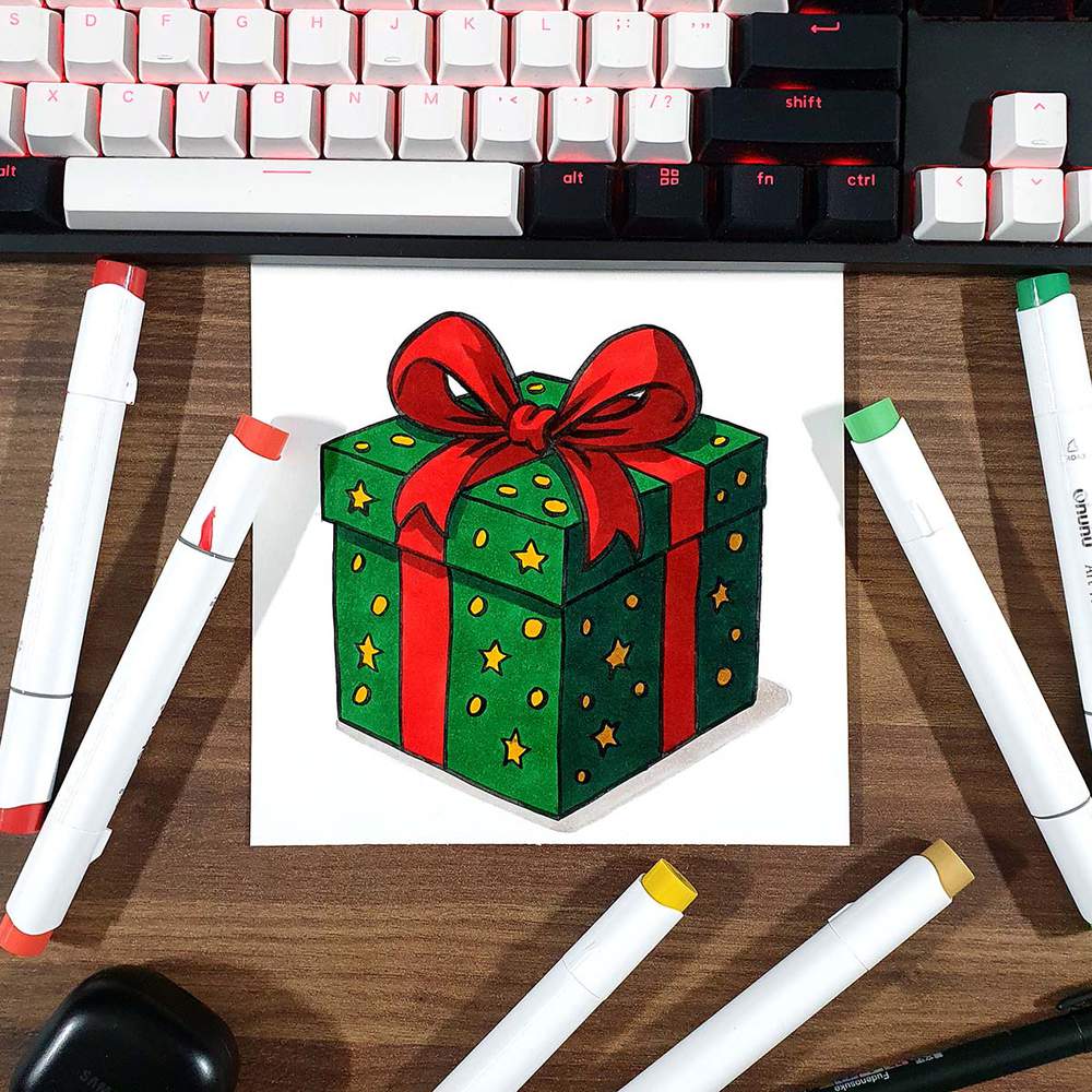 I hope you had fun following this festive tutorial. If you’re up for a creative challenge, try drawing a whole stack of presents, adding different patterns like stripes, snowflakes, or holly leaves.