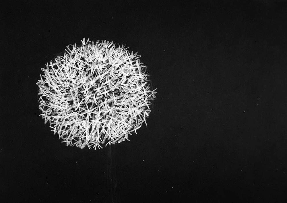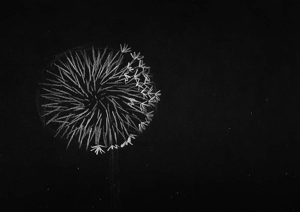 To draw a dandelion, you first sketch a circle on a piece of black paper. Next, you color white lines of varying lengths pointing outwards from the center in that circle. After that, you color a bunch of lines sticking out the ends of each of those lines. Then you color the center of the dandelion brown and the stem green. And if you'd like, you can add a few fly-away seeds too.