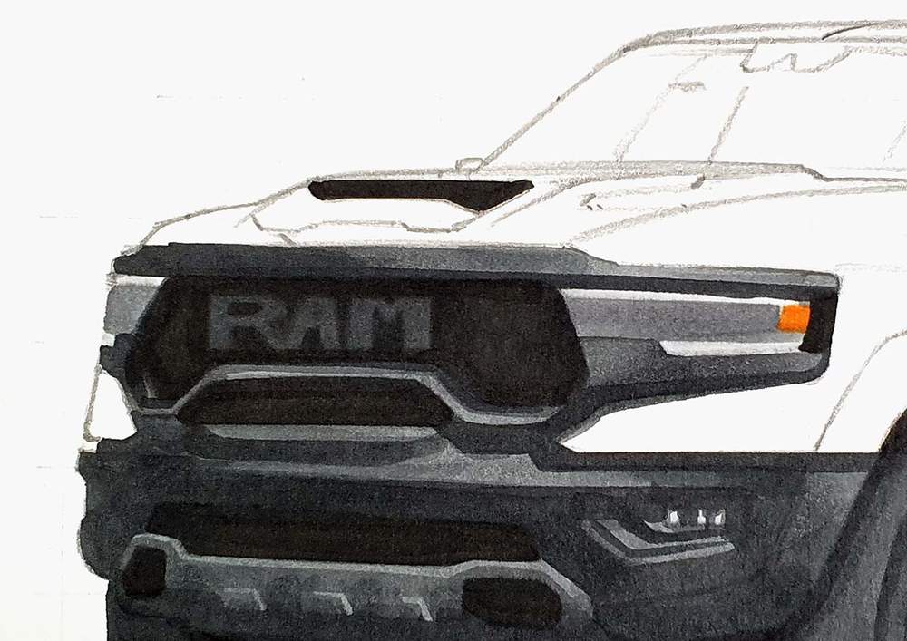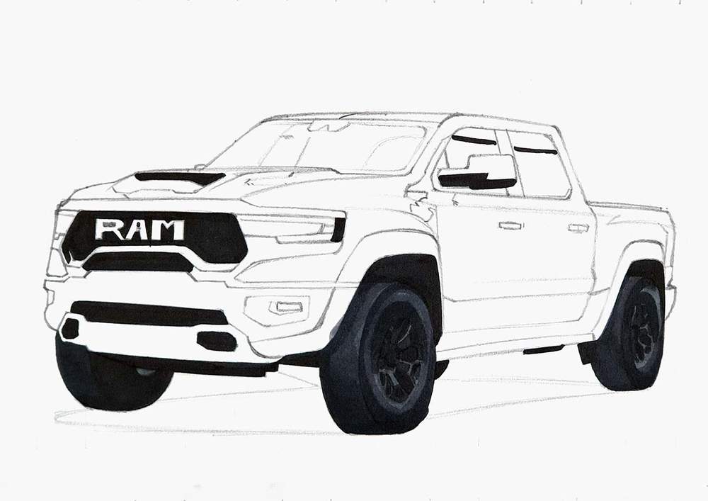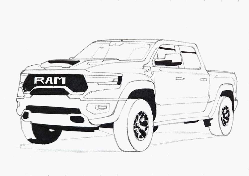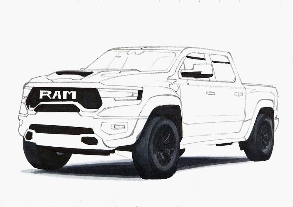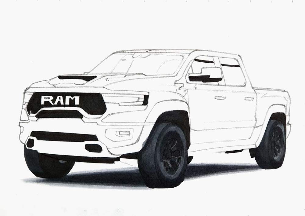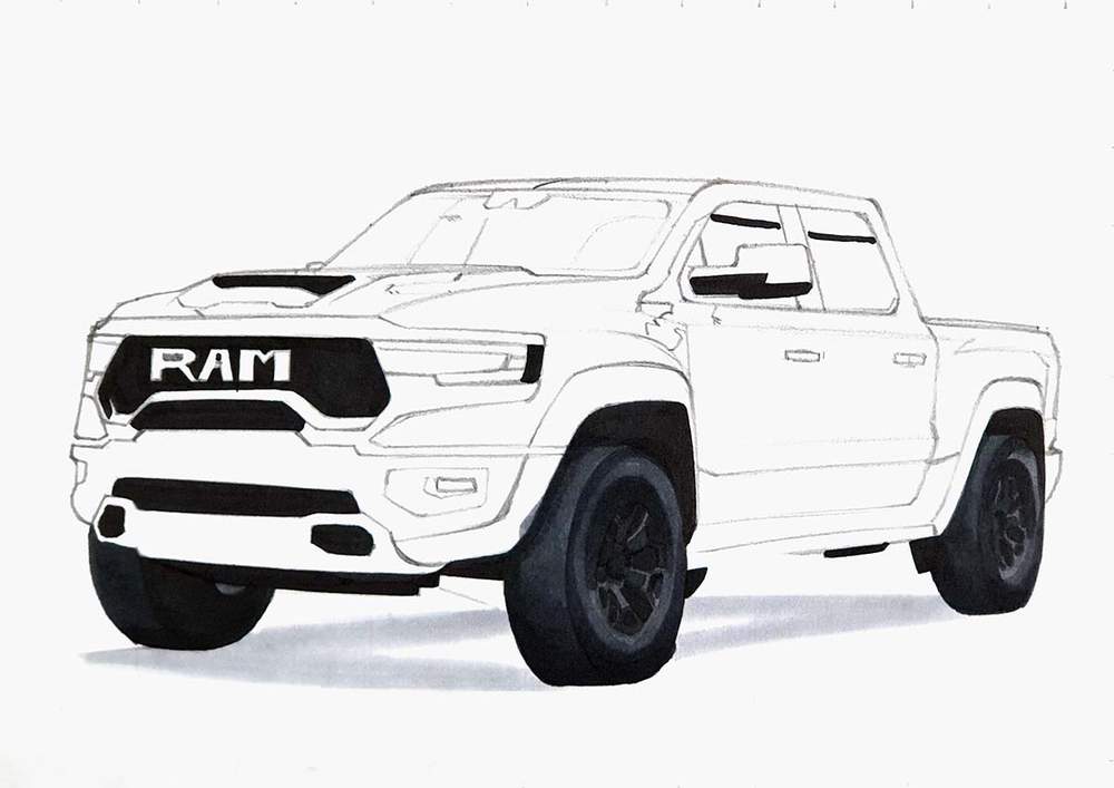 I used the same techniques as before to sketch each line of each part or shape of the RAM truck.