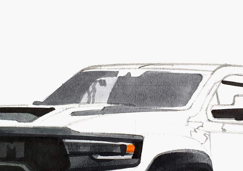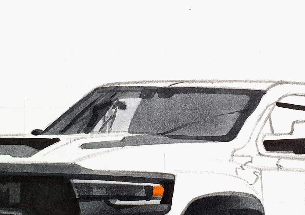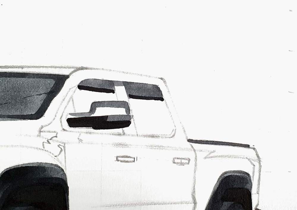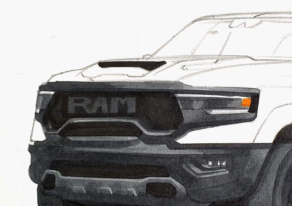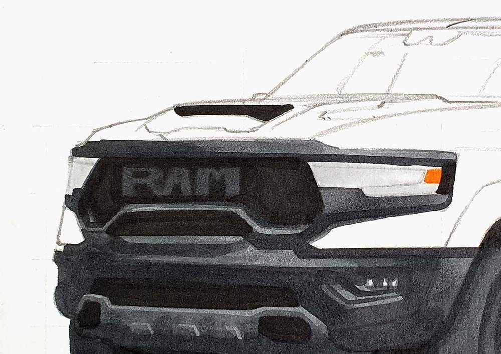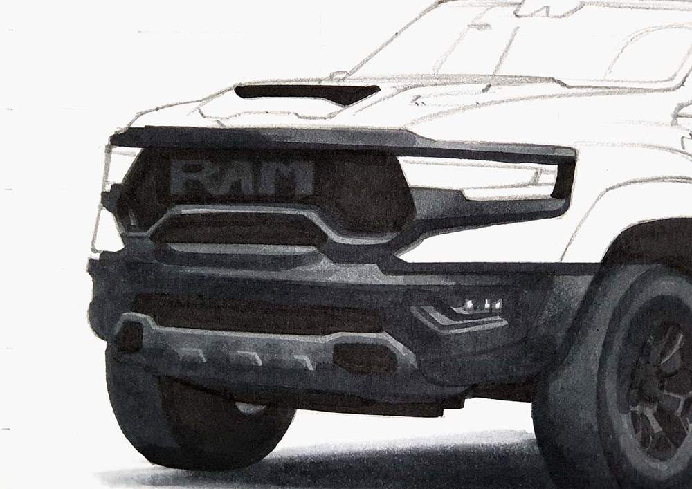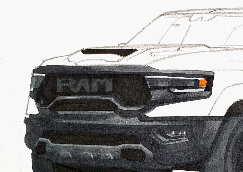 I used the same techniques as before to sketch each line of each part or shape of the RAM truck.