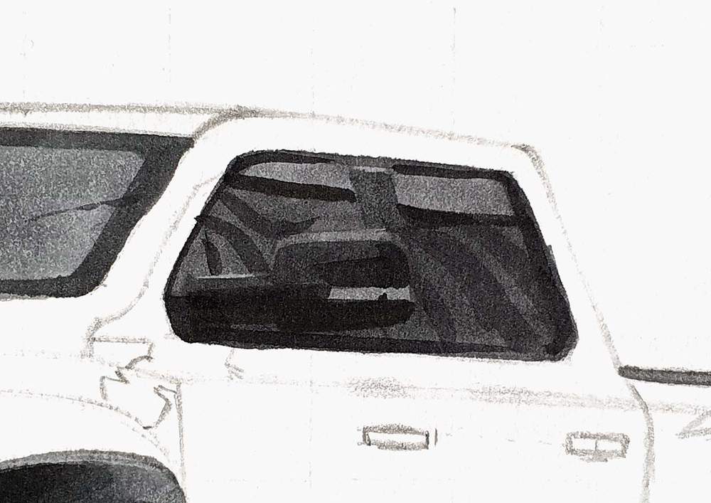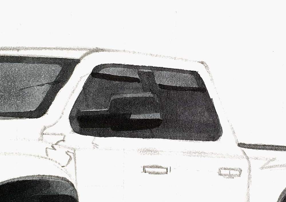 To finish off the sketch, I also marked out some reflections below the door mirror, I sketched the windshield as I forgot to do so earlier, and I sketched the outline of the shadow below the car.