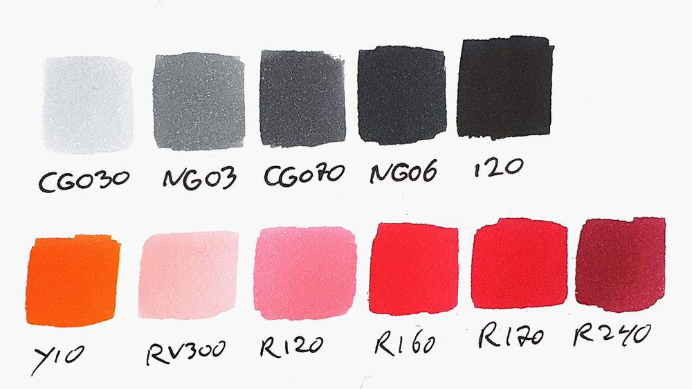 To make this drawing, I used Ohuhu Honolulu markers in the colors Colorless Blender (0), Neutral Grey 03 (CG030), Neutral Grey 3 (NG03), Neutral Grey 07 (CG070), Neutral Grey 6 (NG06), Black (120), Apricot (Y10), Tender Pink (RV300), Light Prawn (R120), Cadmium Red (R160), Lipstick Red (R170), and Garnet (R240).