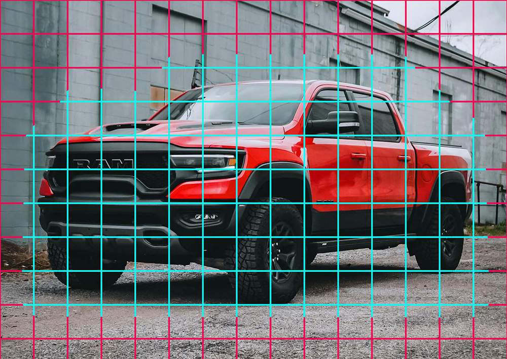 Then, I added this grid overlay to it and marked the squares containing bits of the car in light blue.