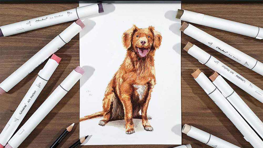 Next, I colored the dog using my favorite markers: Ohuhu Honolulu markers.