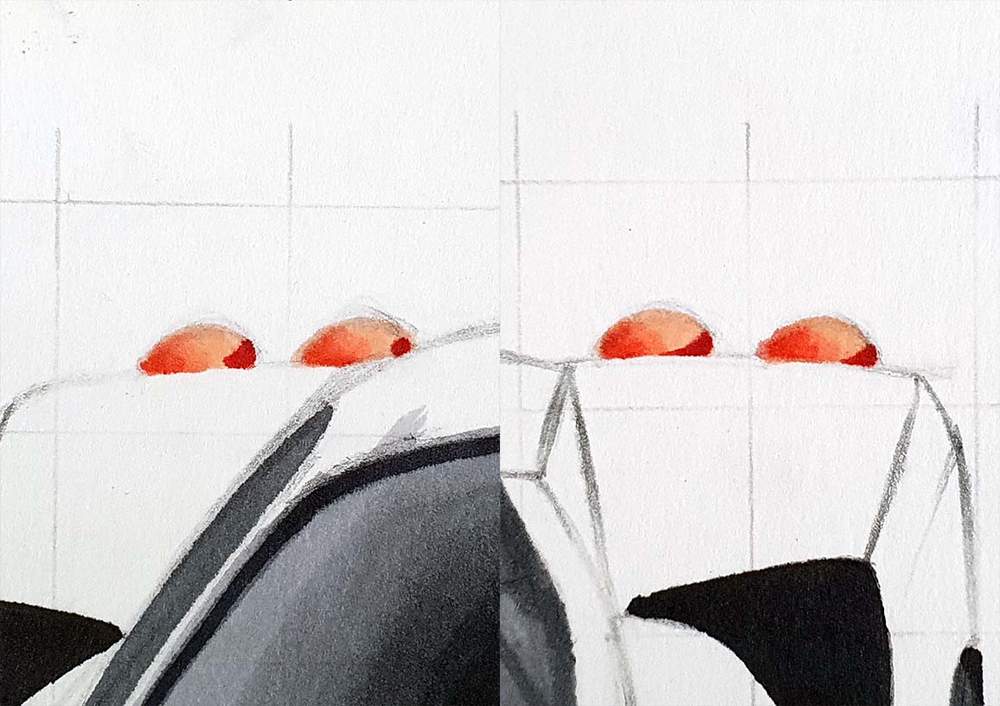 Next, I used the black pencil to add darker details, mainly the panel gaps on the front of the Ferrari.