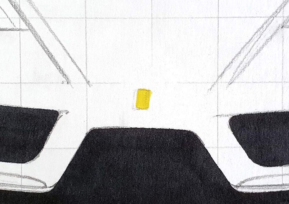 I first used the white pencil to add in the lightest details, especially in the headlights and on some edges of the bodywork. I also used it the lighten the left and right side of the windshield and the top left of the front triangle shape.