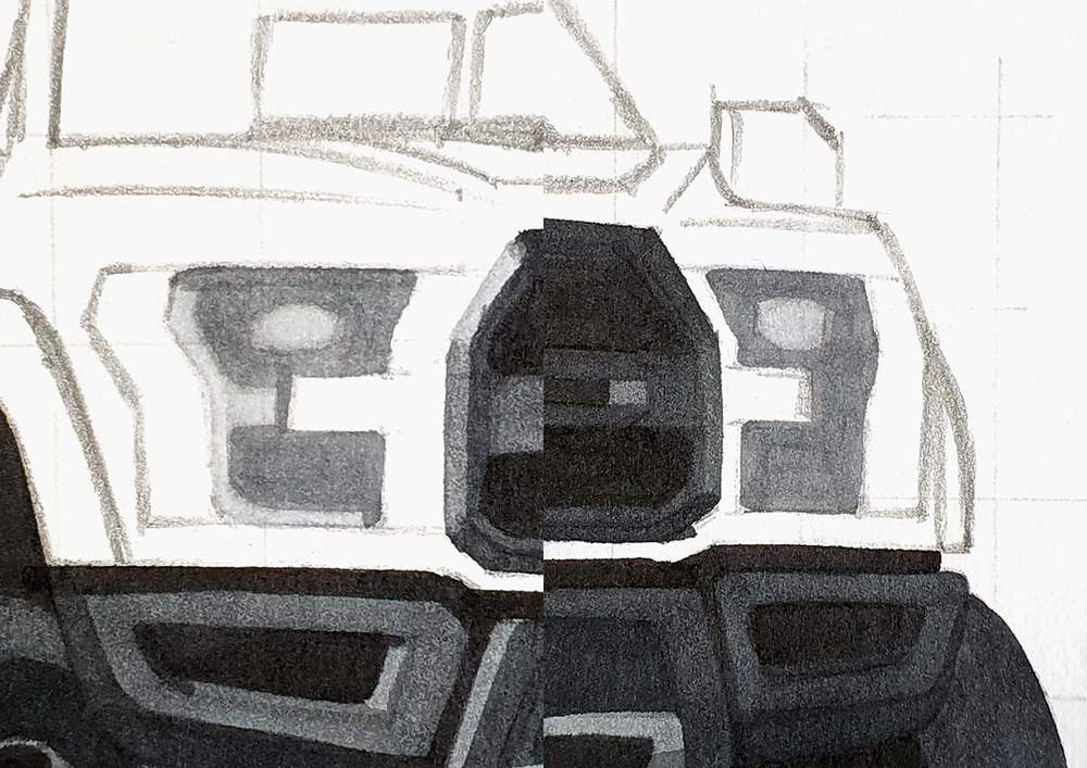 Next, I used CG070 to color the darker parts. On the left headlight I colored everything except for the E-shape on the left edge, the oval, and a rectangle in the bottom.