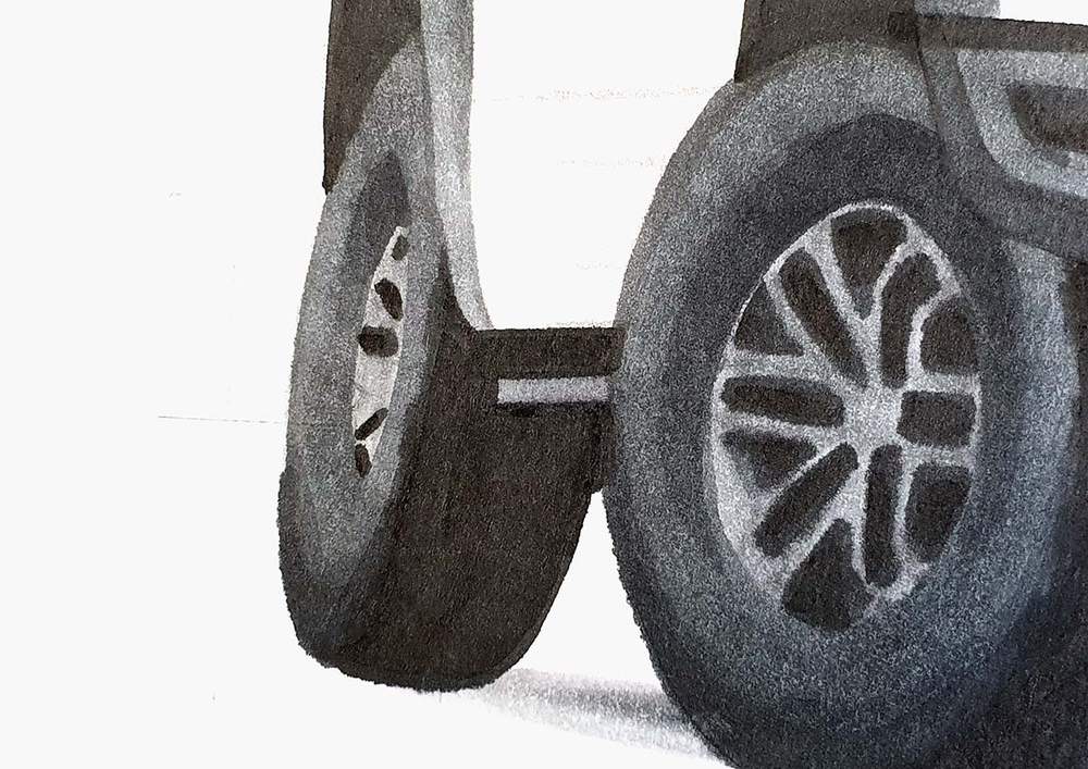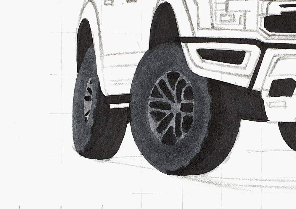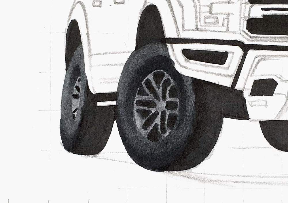 I already sketched the outer edge of the tires when drawing the outline of the Ford Raptor.