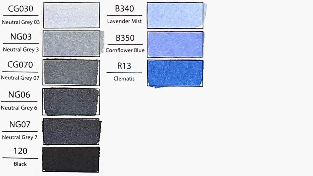To make this drawing I used Ohuhu Honolulu alcohol based markers in the colors Colorless Blender (0), Neutral Grey 03 (CG030), Neutral Grey 3 (NG03), Neutral Grey 07 (CG070), Neutral Grey 6 (NG06), Neutral Grey 7 (NG07), Black (120), Lavender Mist (B340), Cornflower Blue (B350), and Clematis (R13). (Get a 10% discount code here.)