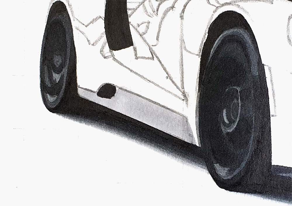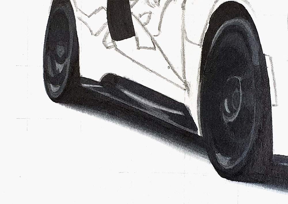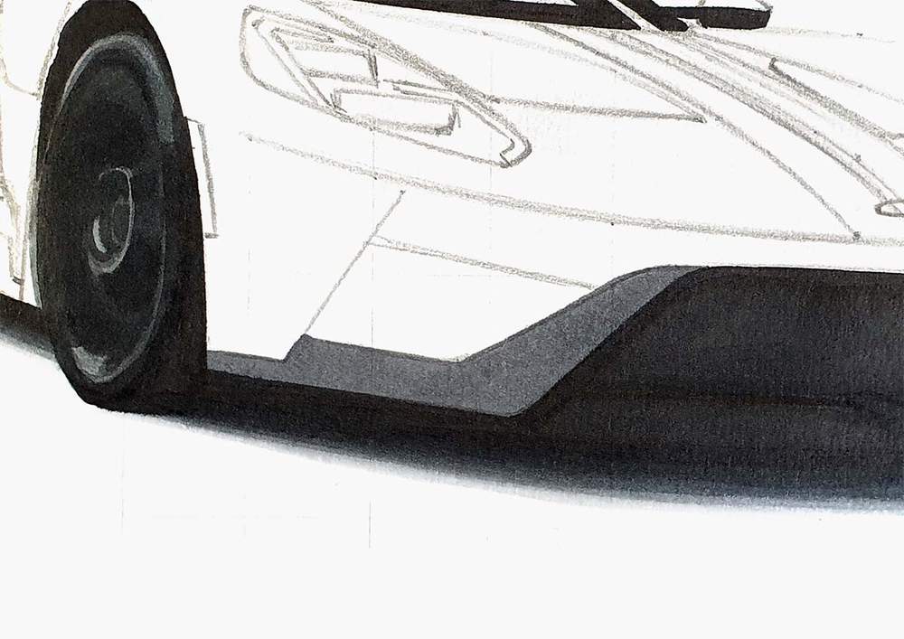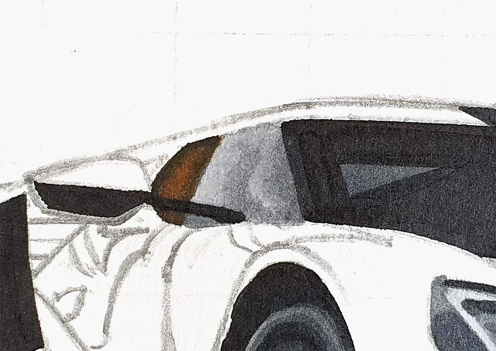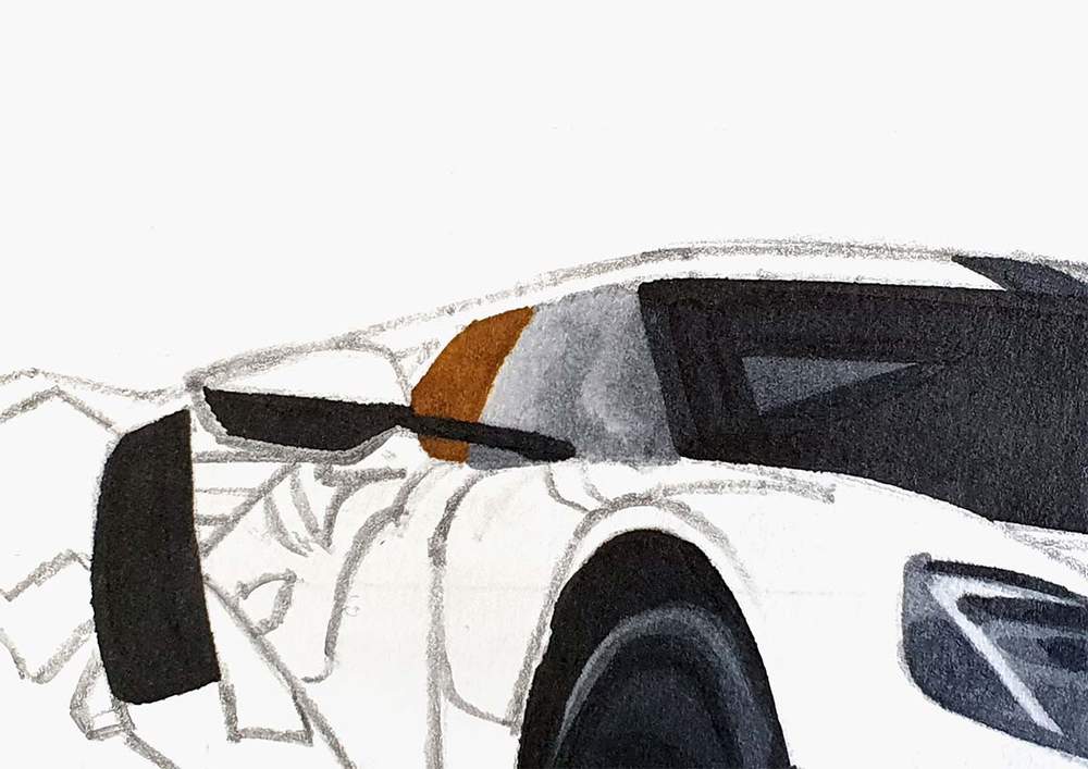 To finish the Ford GT drawing off, I used a white paint marker to add some really bright white highlights on the car, mainly on the side reflections.