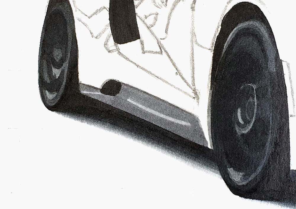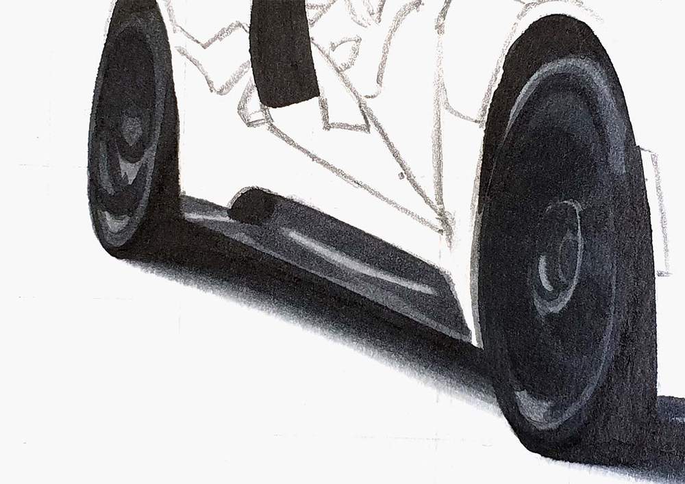 I used the white pencil to add highlights and panel edges and the headlights, and I used it to color the vague wheel bits.