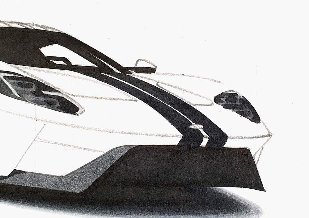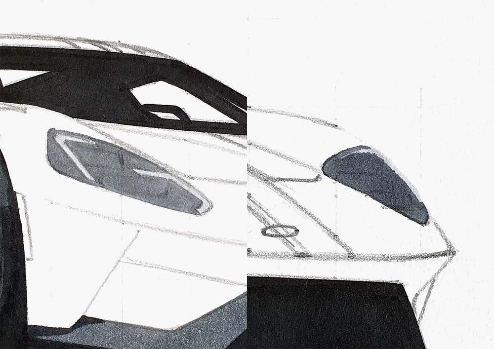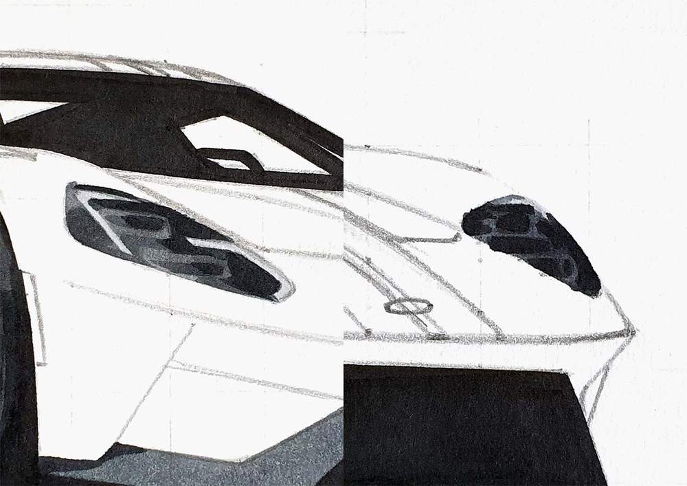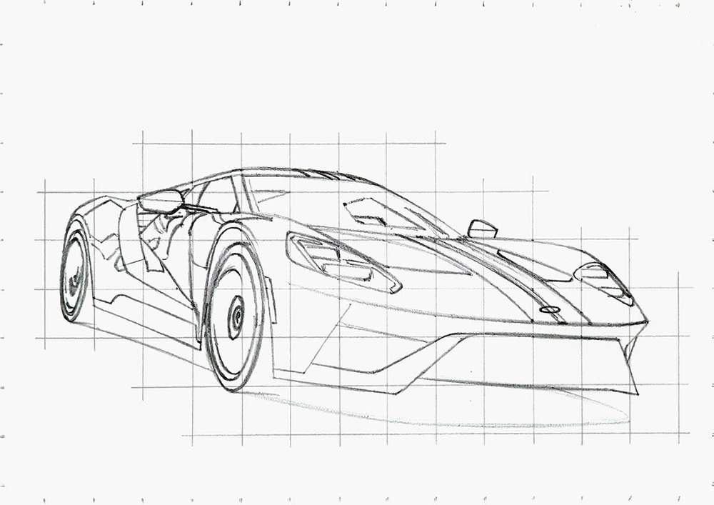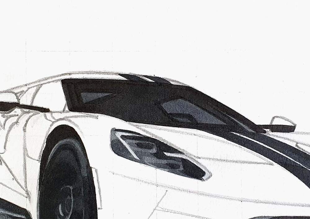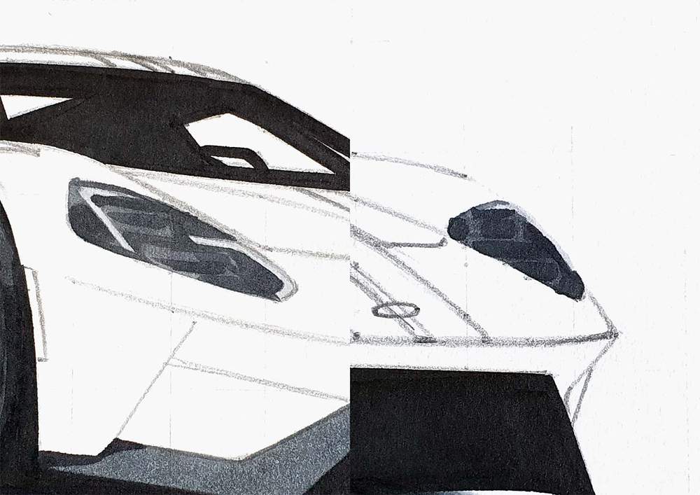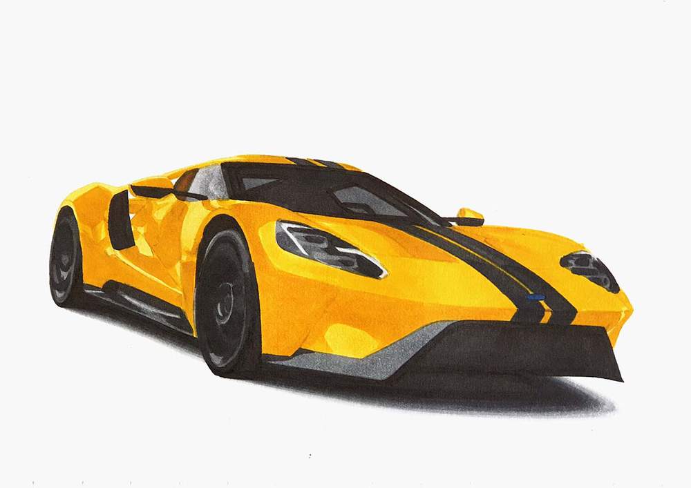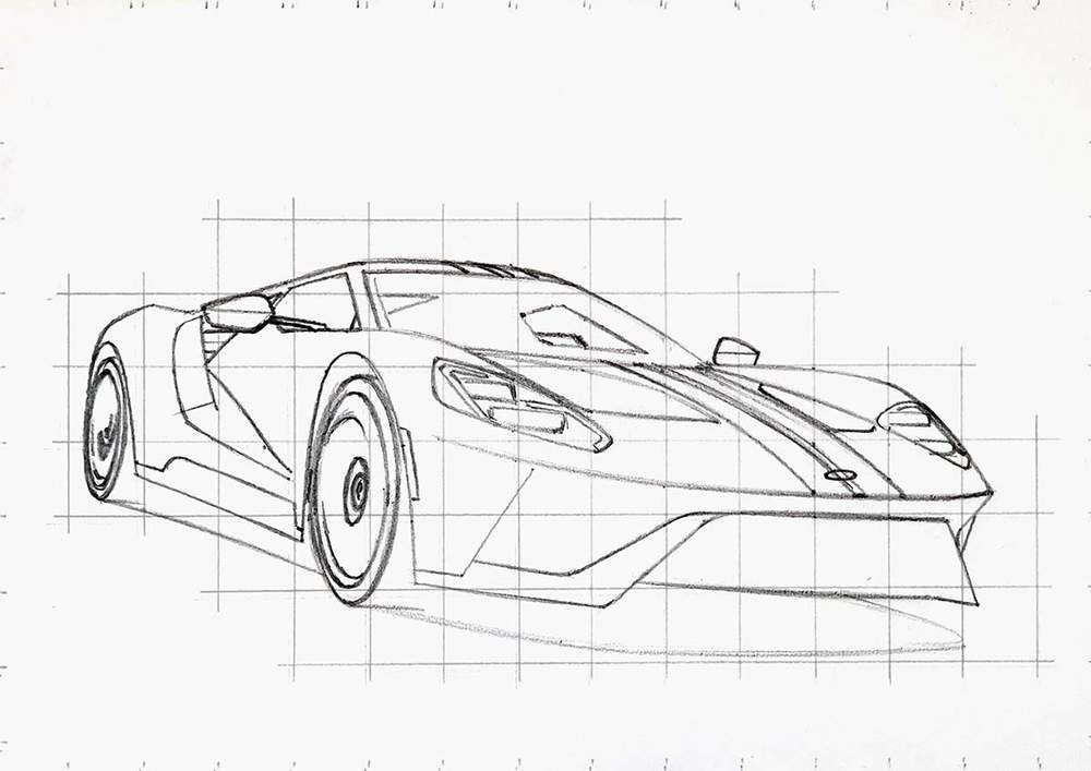 Next, I start sketching the outline of the Ford GT. I like to start on the left and work my way up and around the car section by section, line by line, until the full outline is done.