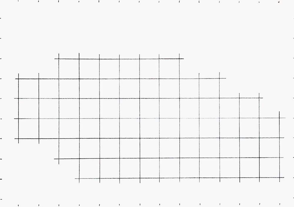 To sketch each line, I first mark where it starts and ends, and where it crosses grid lines. Then, I sketch the line in one motion. I repeat this for the whole outline until it is complete.