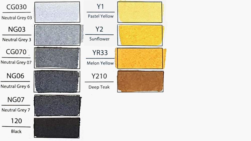 To make this drawing, I used Ohuhu Honolulu alcohol markers in the colors Colorless Blender (0), Neutral Grey 03 (CG030), Neutral Grey 3 (NG03), Neutral Grey 07 (CG070), Neutral Grey 6 (NG06), Neutral Grey 7 (NG07), Black (120), Pastel Yellow (Y1), Sunflower (Y2), Melon Yellow (YR33), Dark Yellow (YR1), Deep Teak (Y210), and Napoleon Blue (PB4). (Get a 10% discount code here.)