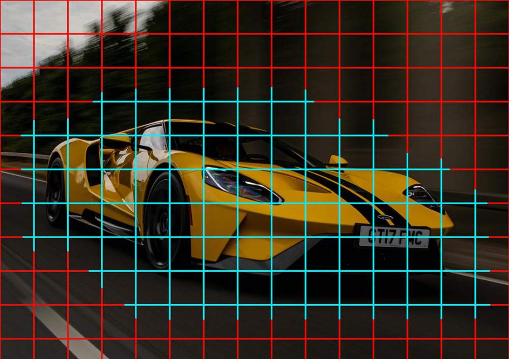 Next, I replicate that grid on my paper. I like to only sketch the squares that are necessary to sketch the whole Ford GT. I previously marked those squares in light blue on the reference photo.