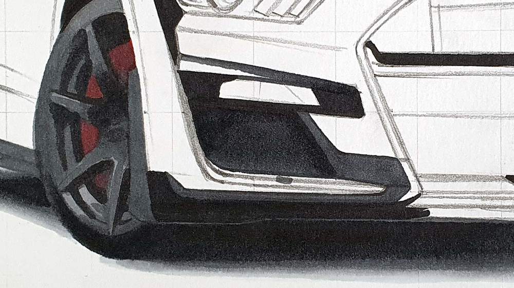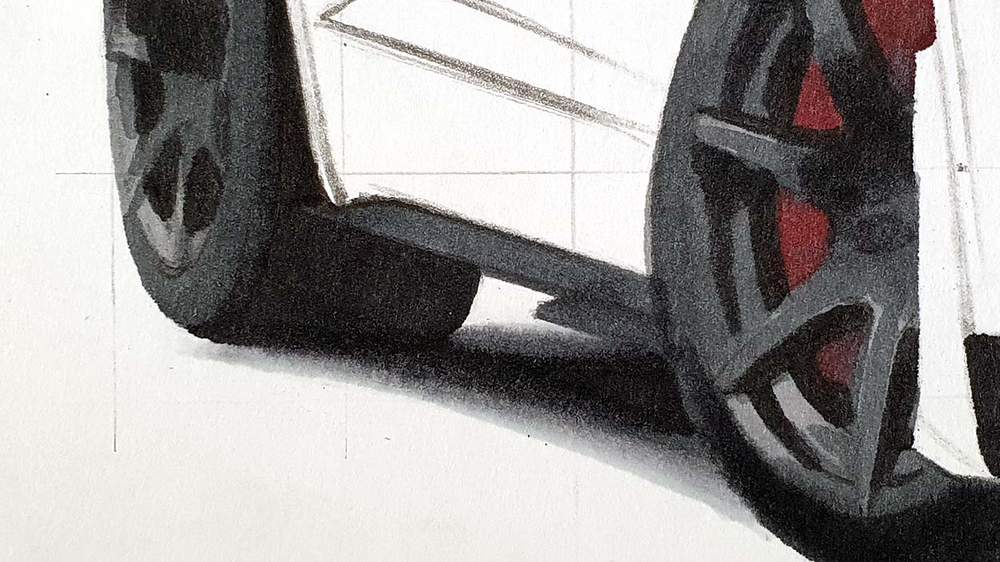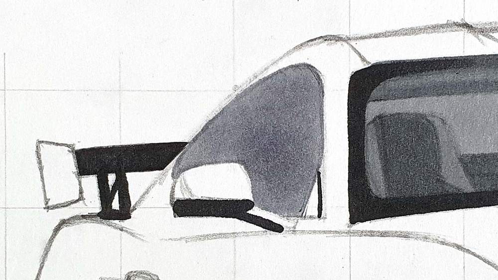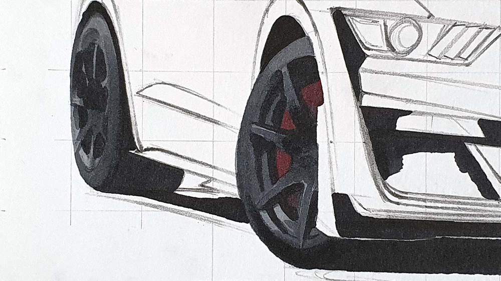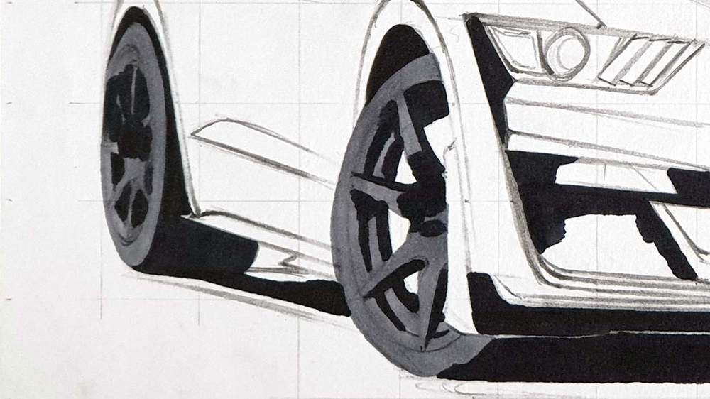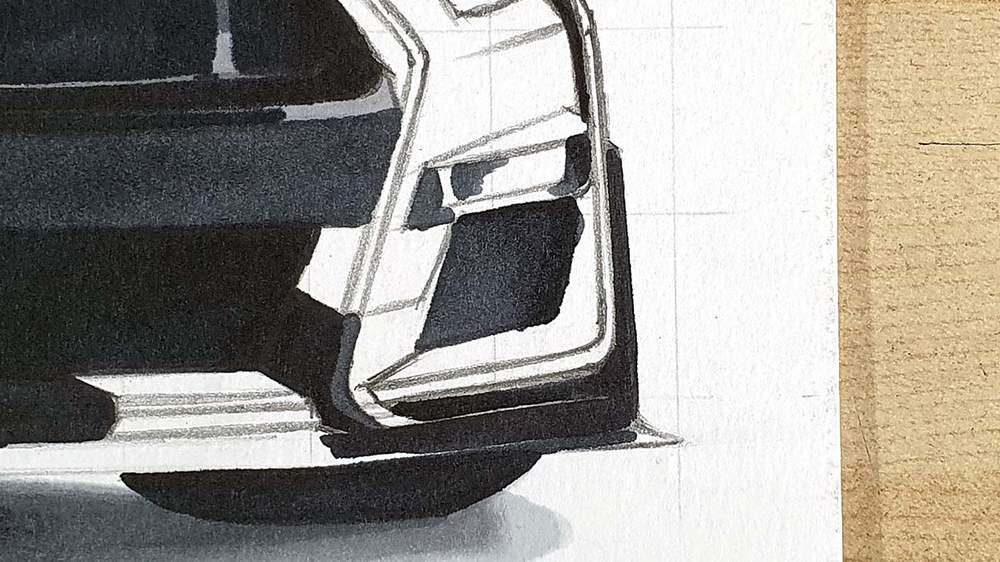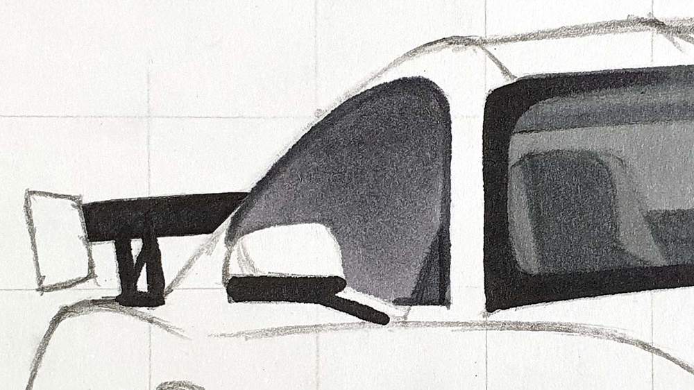 I like to start on the left and work my way up and around the car until the basic shapes are all sketched.