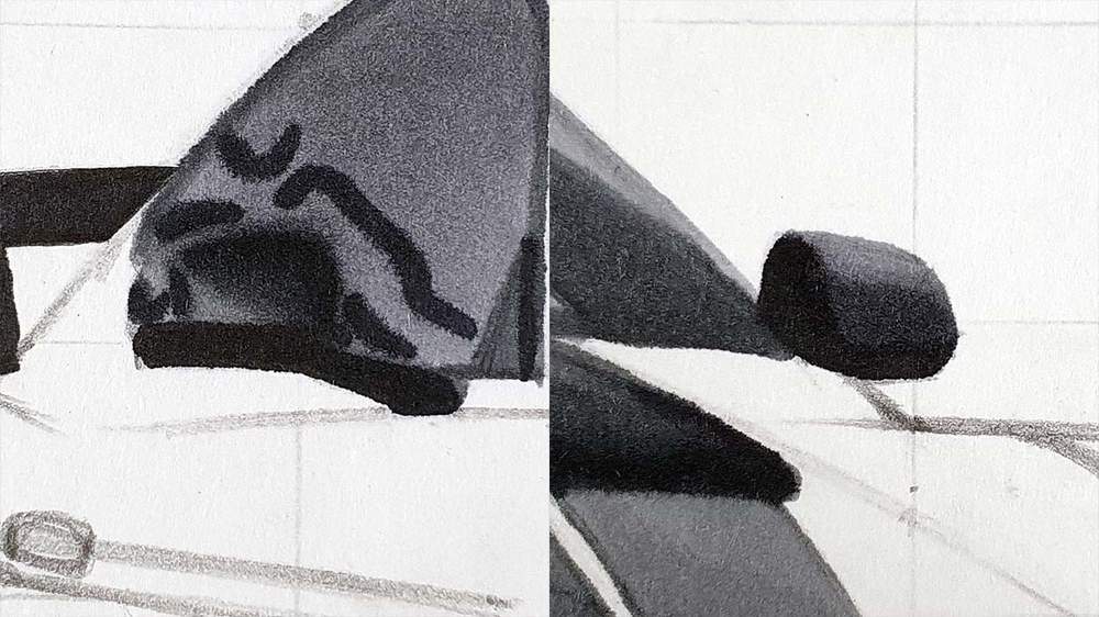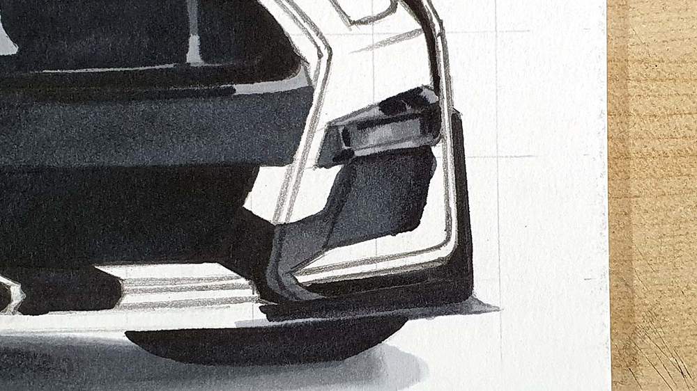 Next, I colored the darker parts in the left headlight with Neutral Grey 05 (CG050) and Neutral Grey 07 (CG070), and I added some details in the right headlights using the same colors.