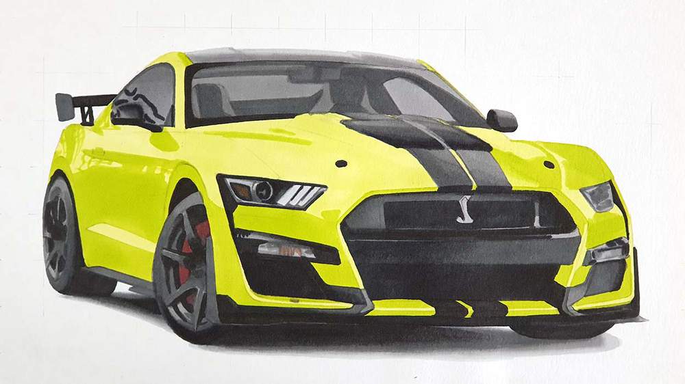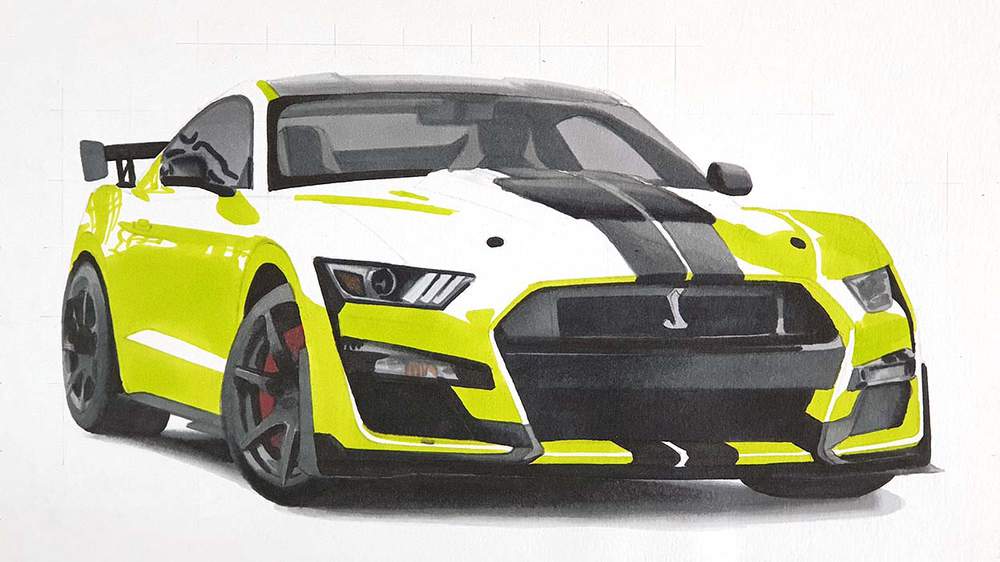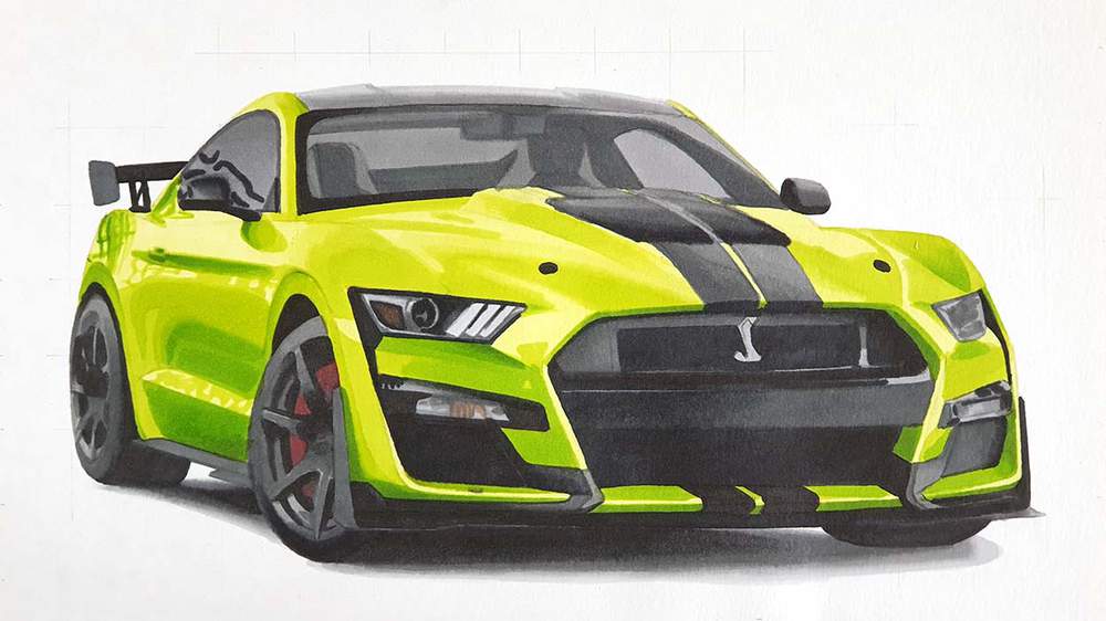 Step 16: Add Details with Colored Pencils on the Mustang GT500