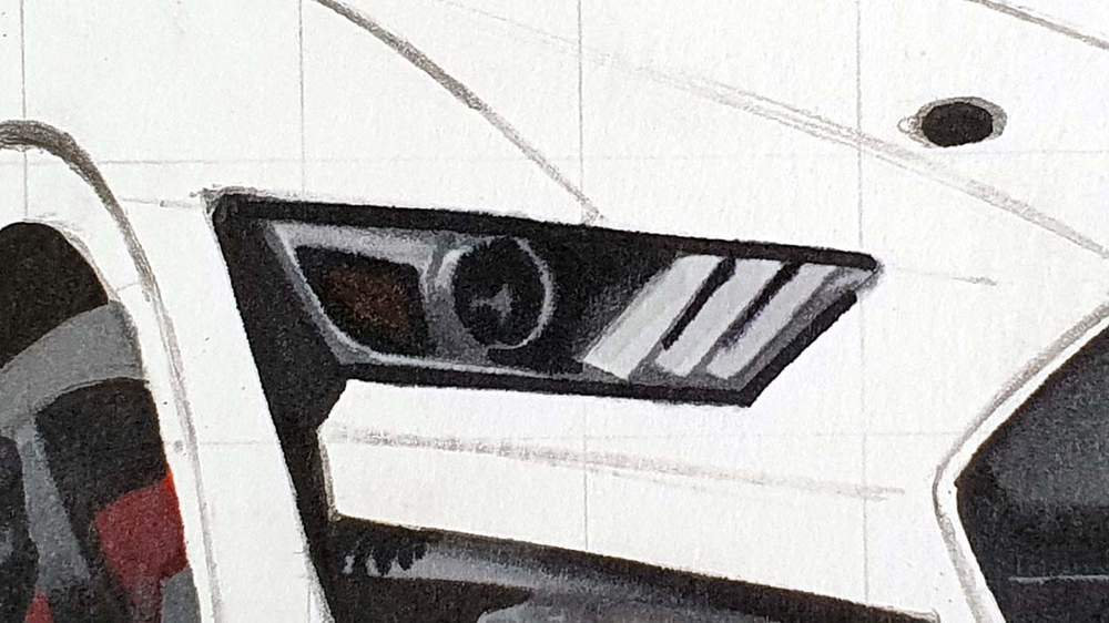 Now, the last step in drawing Shmee's Mustang Shelby GT500 is adding some pure white details with a Posca paint marker.