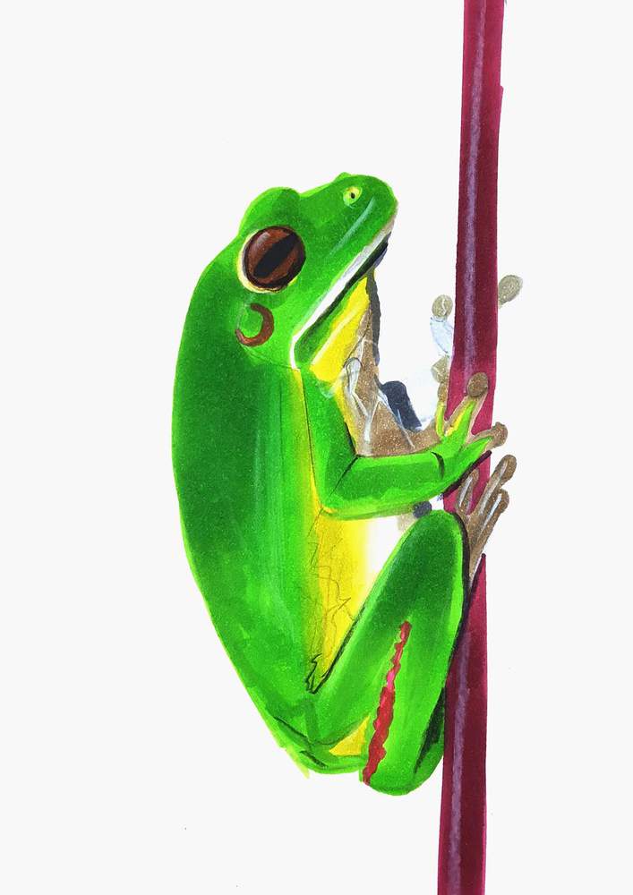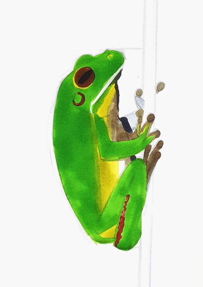To draw a frog, you first sketch the stem the frog is sitting on. Then you mark the top, left, and bottom edges of the frog to use as a guide. Next, you sketch the frog step-by-step until you've sketched all the parts. Lastly, you color the frog using markers and you add just a few details with a white and a black colored pencil.