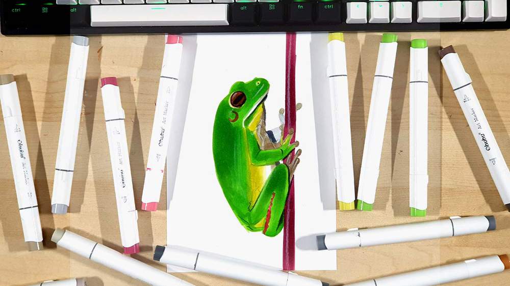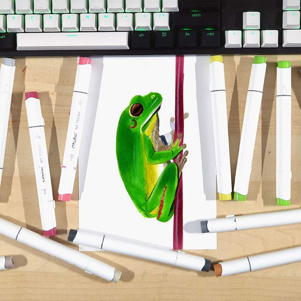 To make this frog drawing, I used Ohuhu Honolulu markers in the colors G070 Lemon Green, G170 May Green, G190 Olive Green, YG080 Yellow Grey 08, E300 Clay, E260 Leather, CG030 Neutral Grey 03, CG070 Neutral Grey 07, 120 Black, R200 Carolessence, and R240 Garnet.