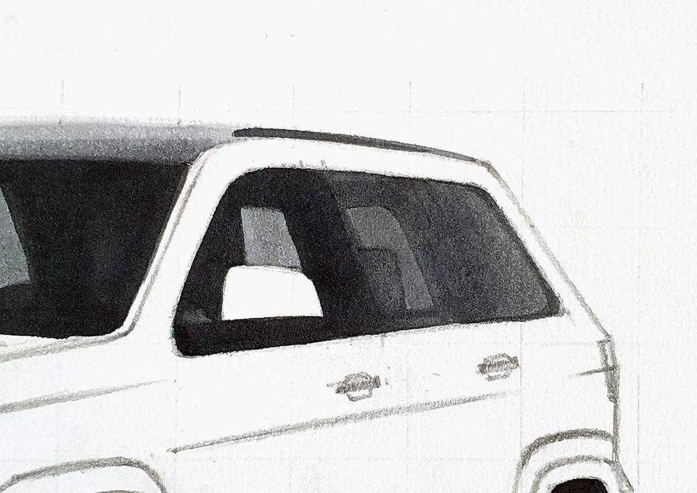 First, I used a black and a white colored pencil to add some details to the Jeep.