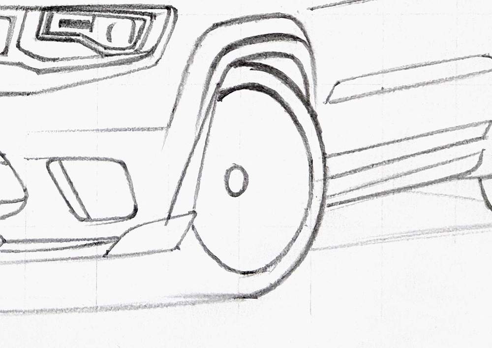 I first sketched the basic outlines of the headlights, the grills, the windows, etc. I also added the most distinct body lines.