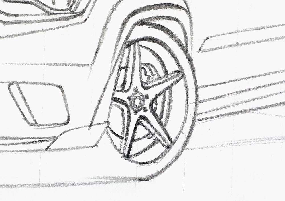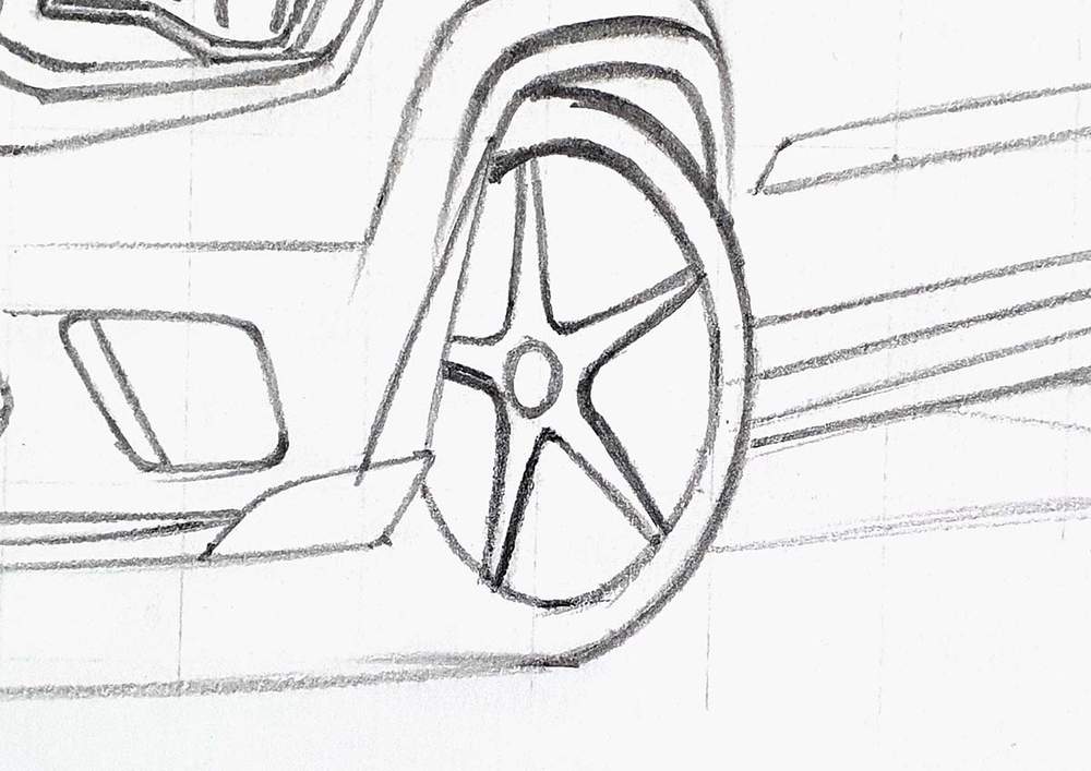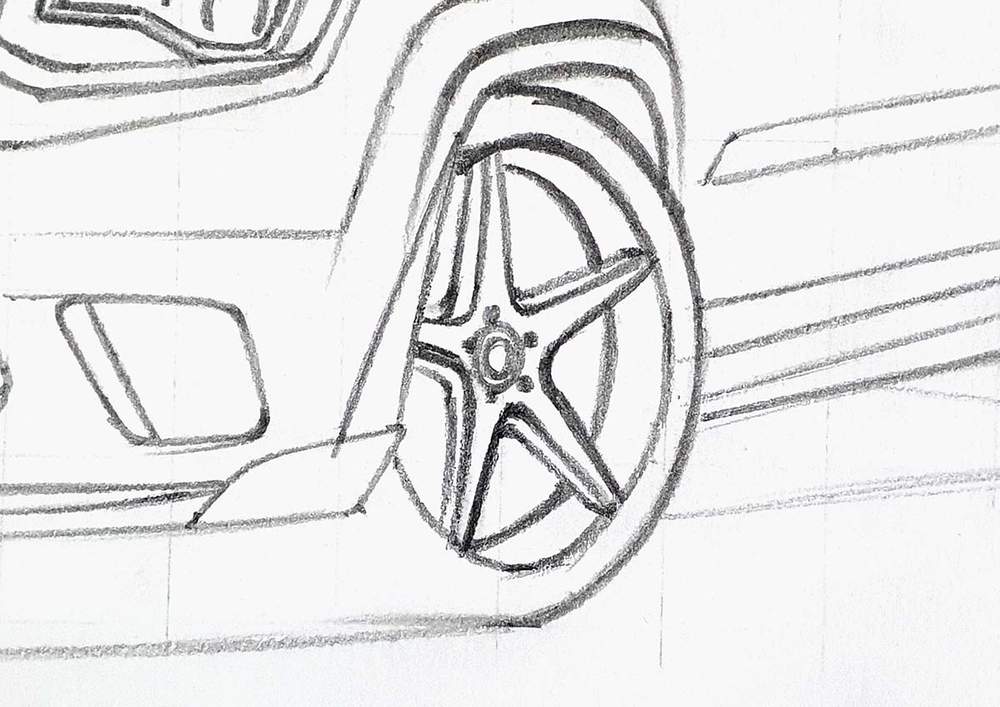 In step 3, I already sketched the outline of the wheels. I did this by marking the top, right, and bottom edges. Next, I mark where the outer edge of the tire crosses grid lines, and then I sketch the outline as smoothly as possible.