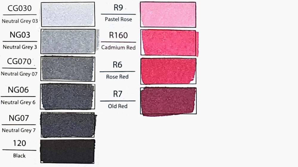To make this drawing, I used Ohuhu Honolulu markers in the colors Colorless Blender (0), Neutral Grey 03 (CG030), Neutral Grey 3 (NG03), Neutral Grey 07 (CG070), Neutral Grey 6 (NG06), Neutral Grey 7 (NG07), Black (120), Pastel Rose (R9), Cadmium Red (R160), Rose Red (R6), and Old Red (R7). (Get a 10% discount code here.)