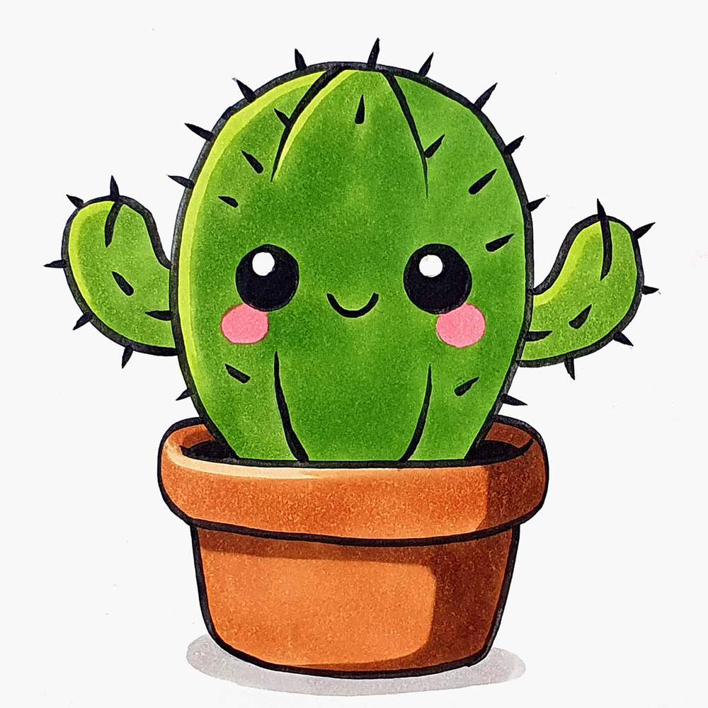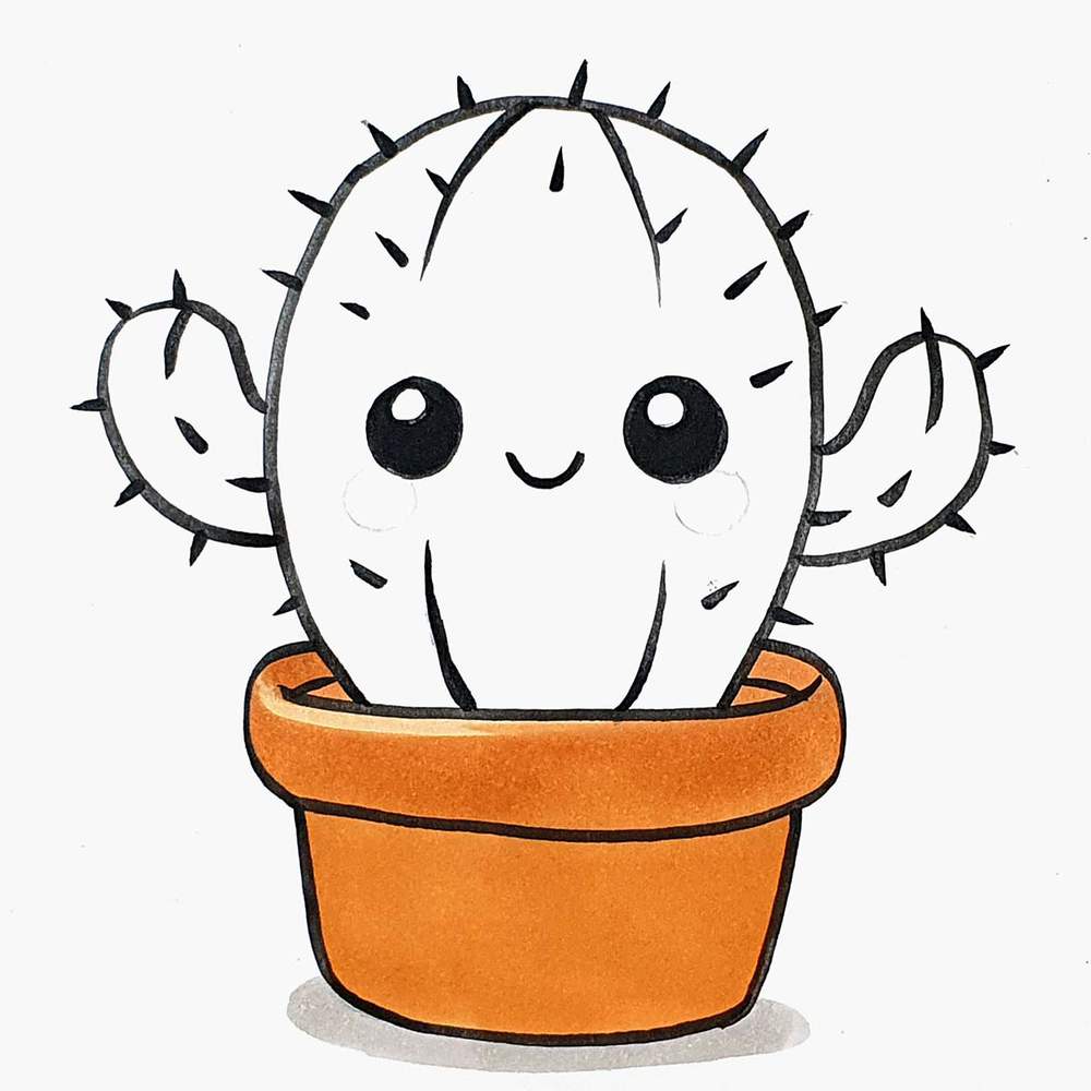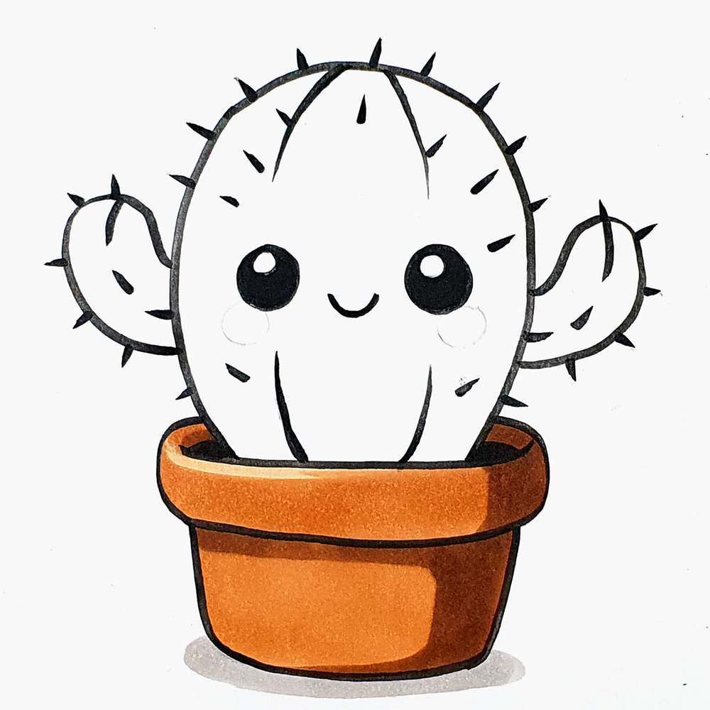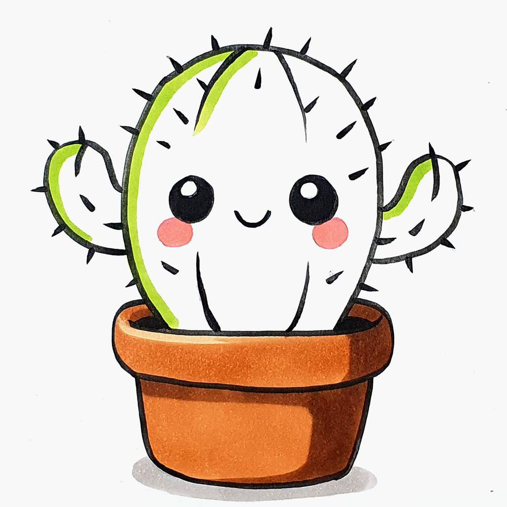 To draw a kawaii cactus, start with a round plant pot. Then sketch a big, balloon-shaped cactus with chubby arms and texture lines. Add a cute face, spikes, and outline your drawing with a bold pen. Finally, color it in with soft greens and warm browns to bring your cactus to life!