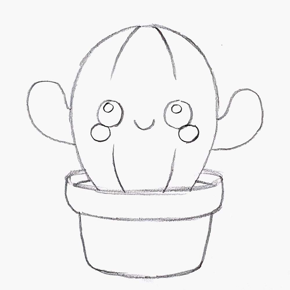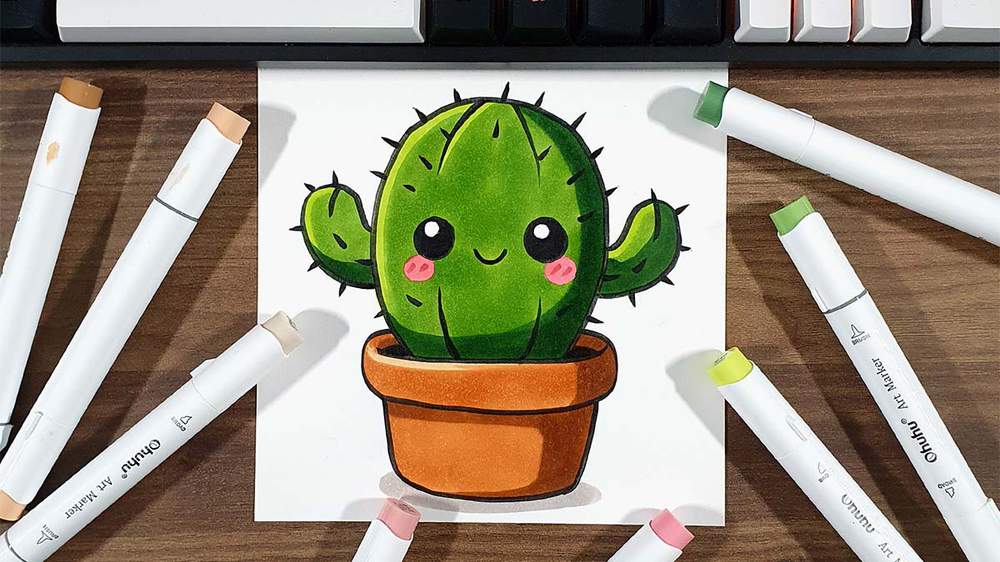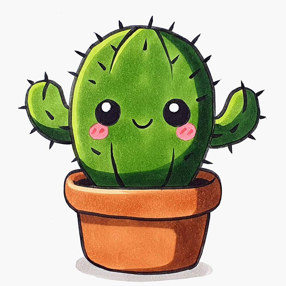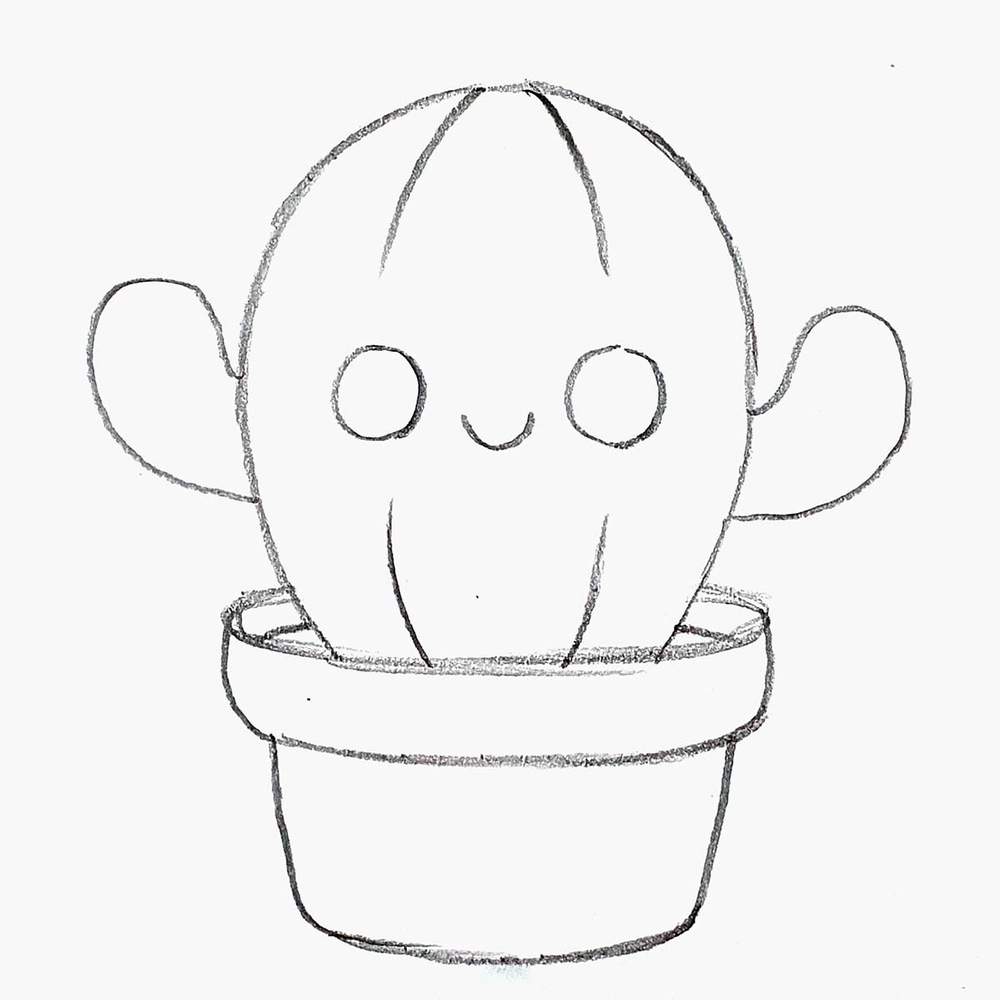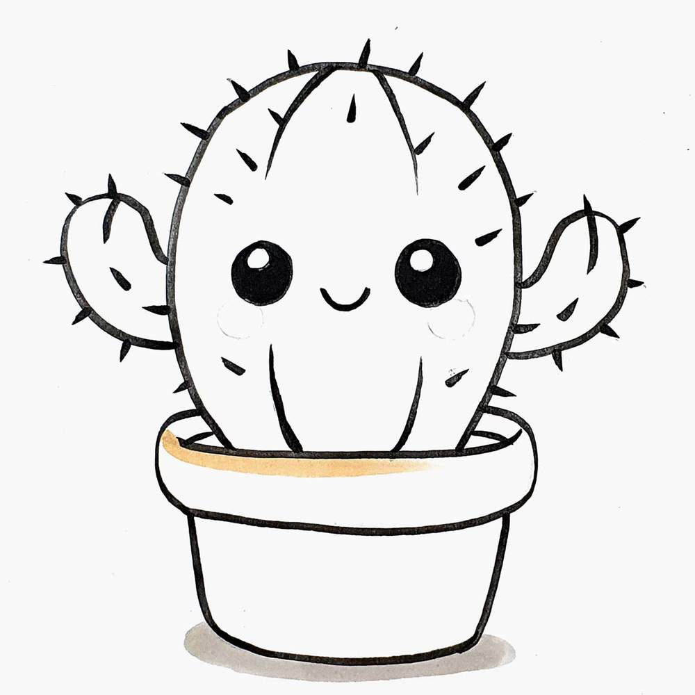 To draw a kawaii cactus, start with a round plant pot. Then sketch a big, balloon-shaped cactus with chubby arms and texture lines. Add a cute face, spikes, and outline your drawing with a bold pen. Finally, color it in with soft greens and warm browns to bring your cactus to life!