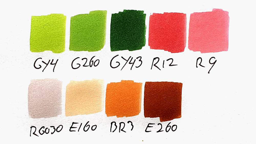 To make this drawing, I used Ohuhu Honolulu markers in the colors Red Grey 03 (RG030), Soft Sun (E160), Rose Beige (BR3), Leather (E260), Yellow Green (GY4), Apple Green (G260), Deep Olive Green (GY43), Rose Buvard (R12), and Pastel Rose (R9).