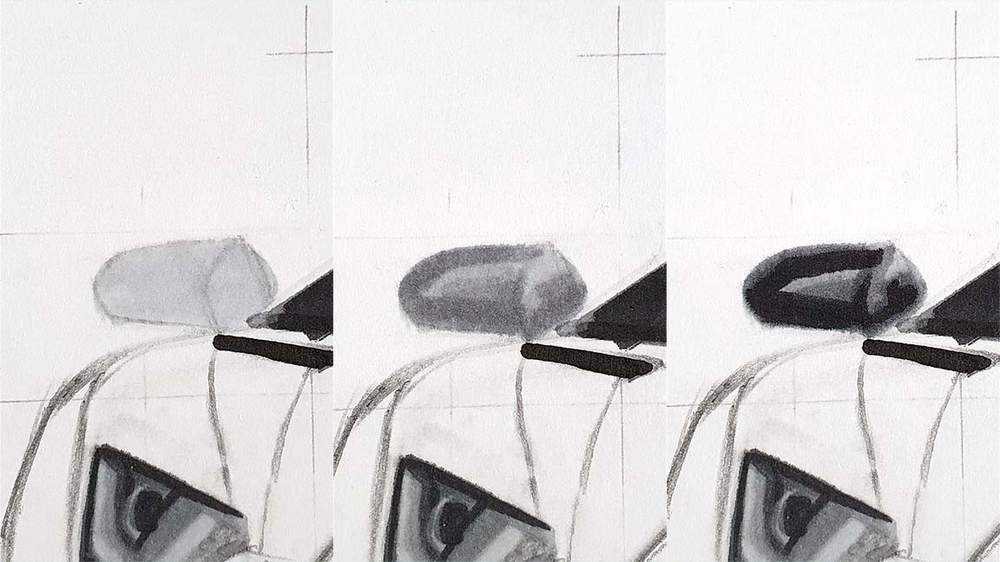 I first colored the left mirror fully with Ice Grey 1. Then I darkened the top, left, bottom and bottom right using Ice Grey 4. Next, I darkened those parts even more using Black.