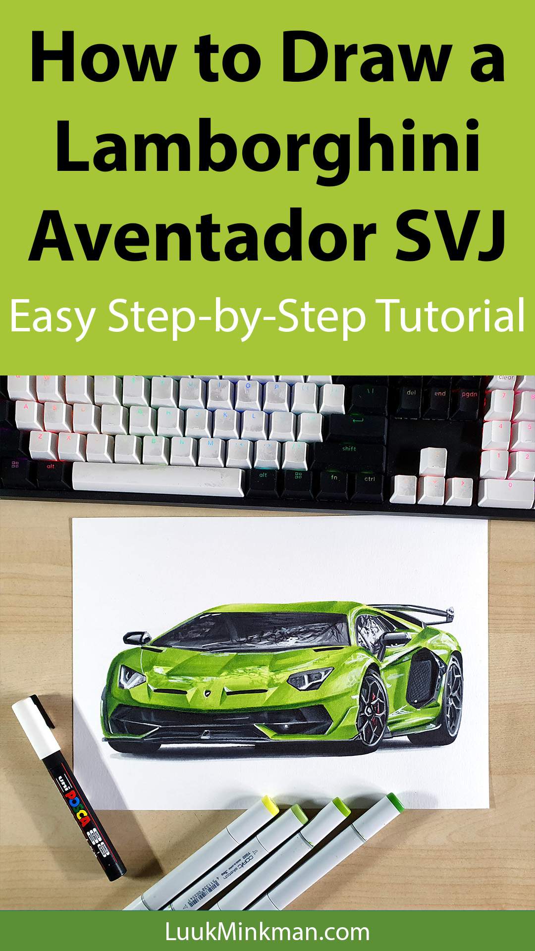 To make a drawing of a Lamborghini Aventador SVJ, I started by making a sketch using the grid method. Then I colored all black and grey parts using alcohol markers as well as the green body color. Lastly, I added some details using a black, white and grey colored pencil and a white Posca paint pen to add highlights.