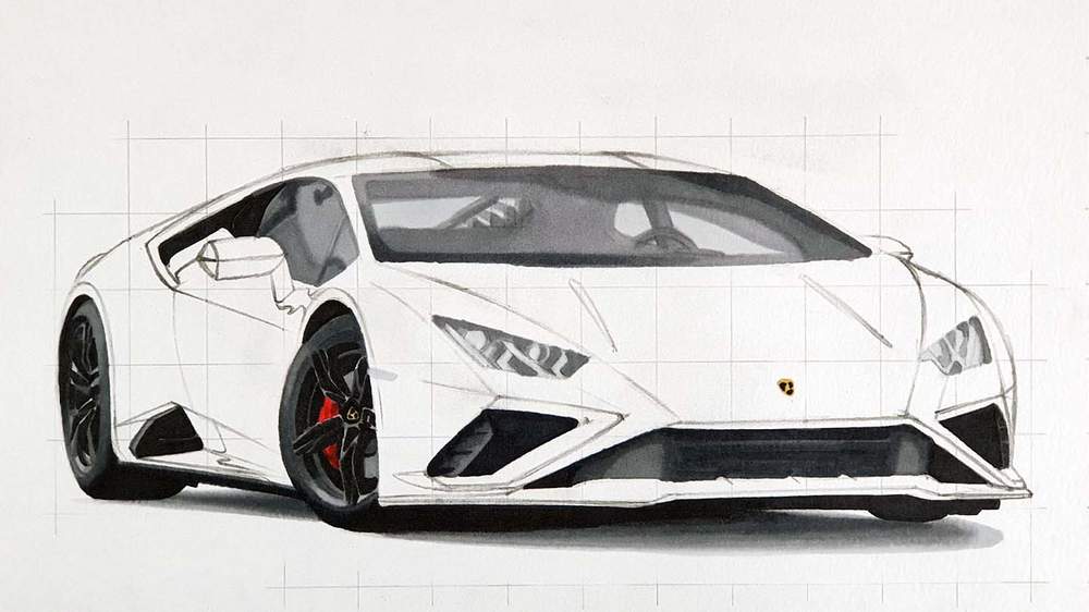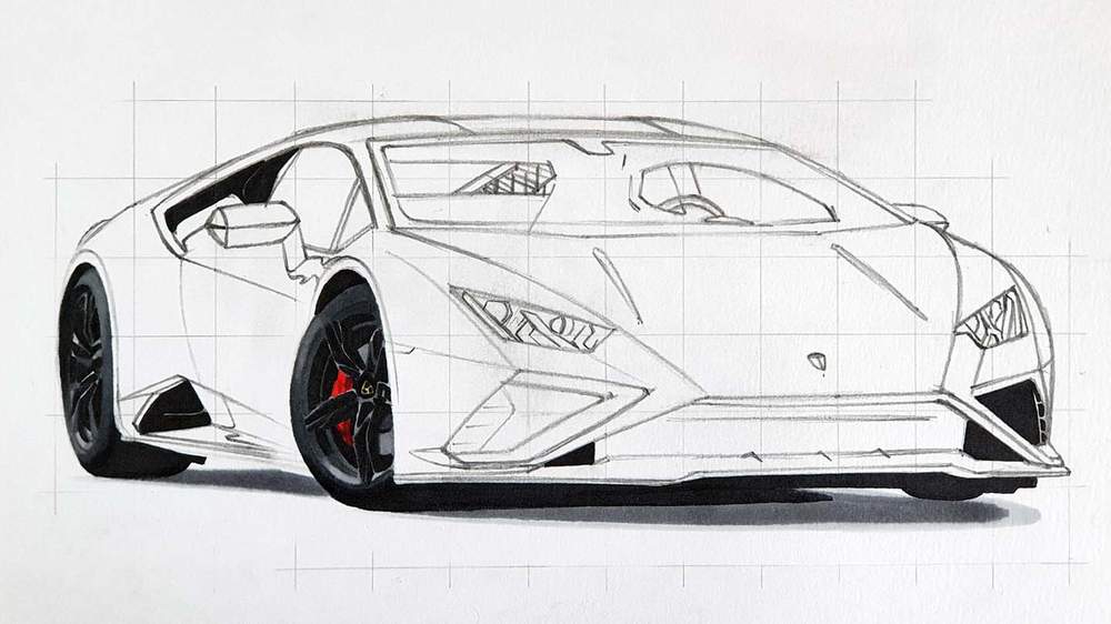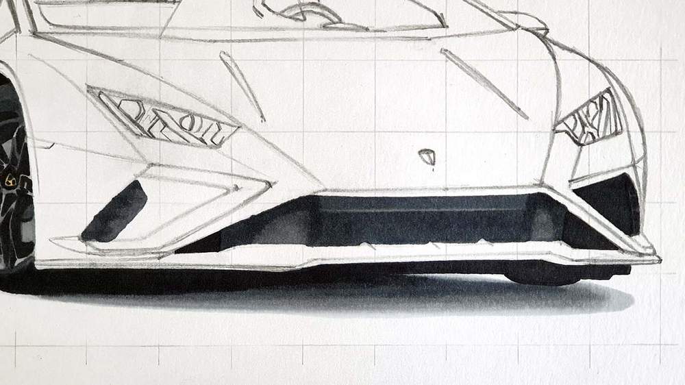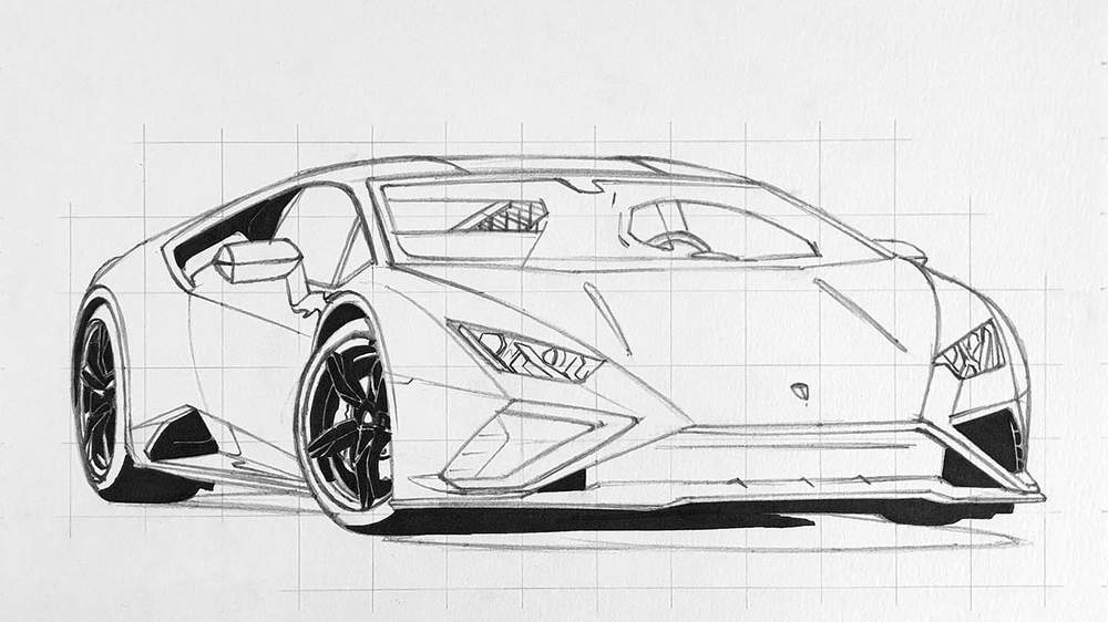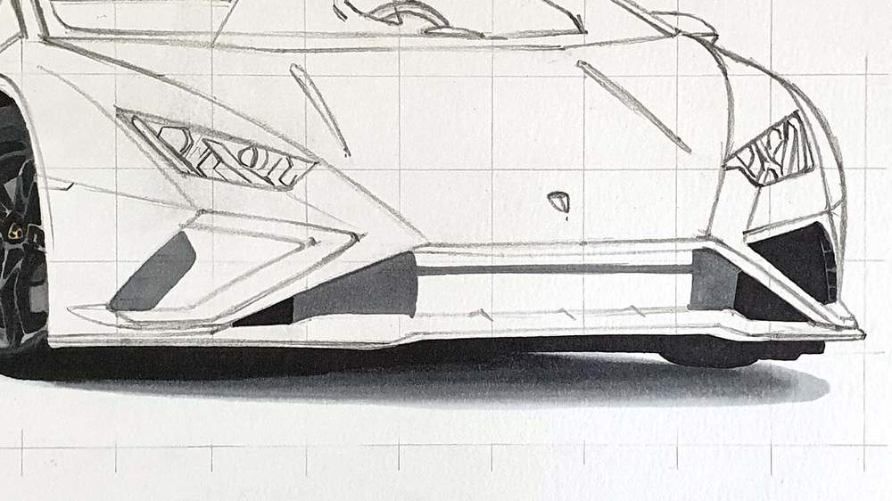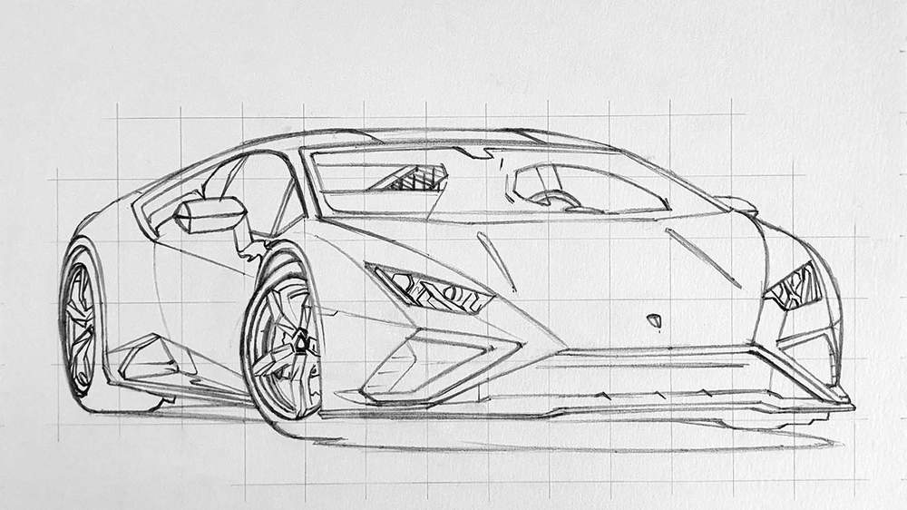 To minimize the lines that need to be erased when the drawing is done, I actually only sketched the necessary squares to sketch the Lamborghini Huracán Evo.