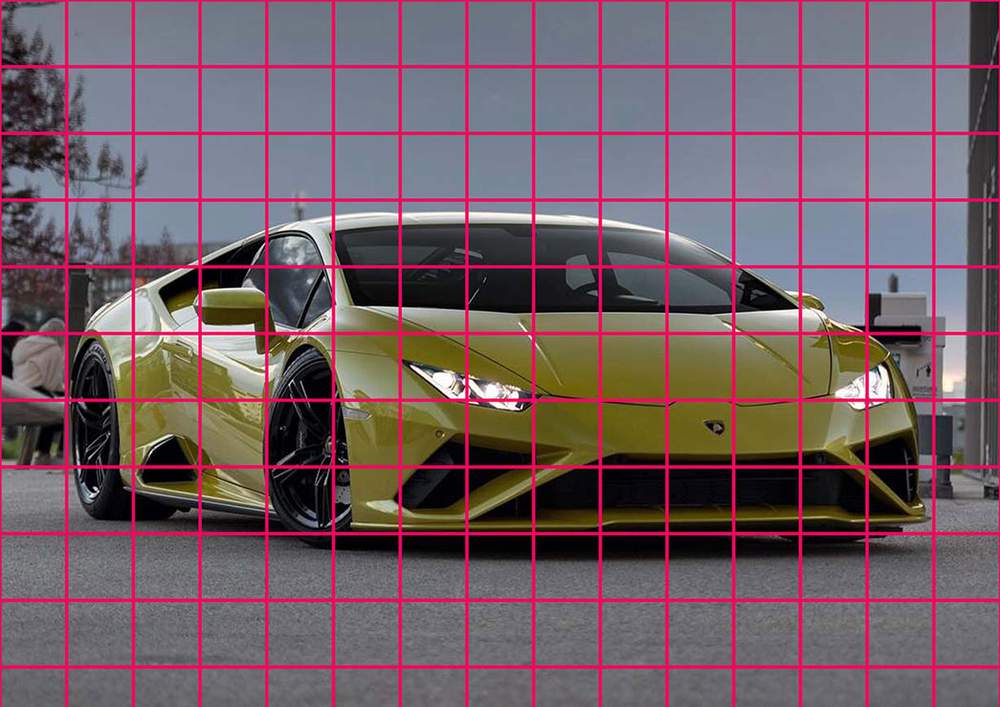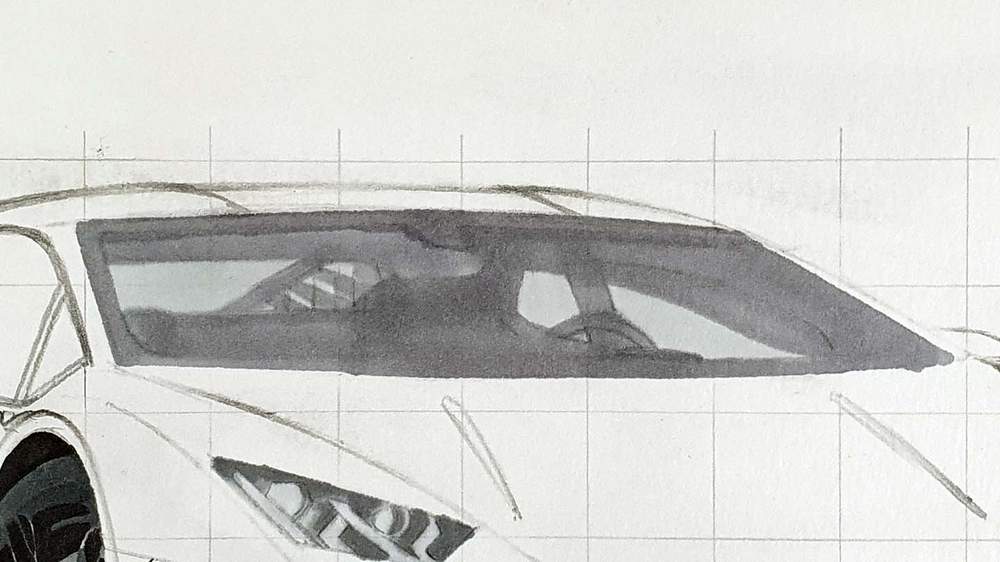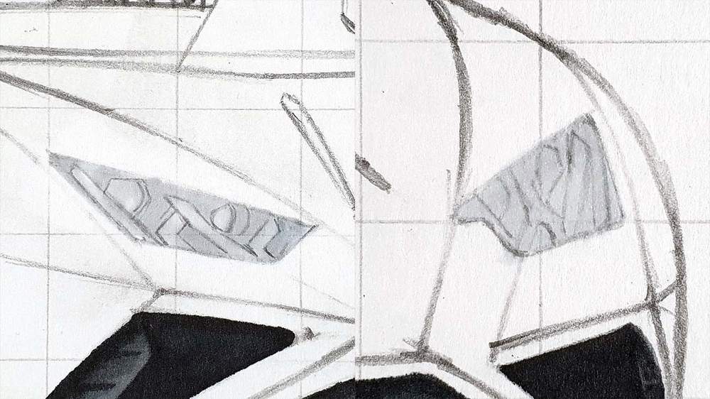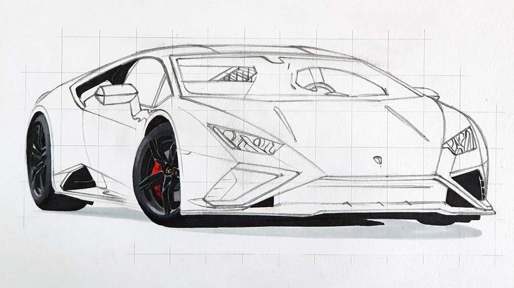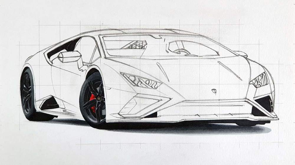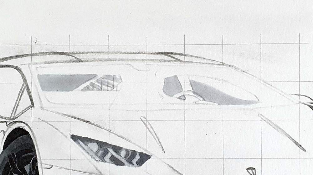 To minimize the lines that need to be erased when the drawing is done, I actually only sketched the necessary squares to sketch the Lamborghini Huracán Evo.
