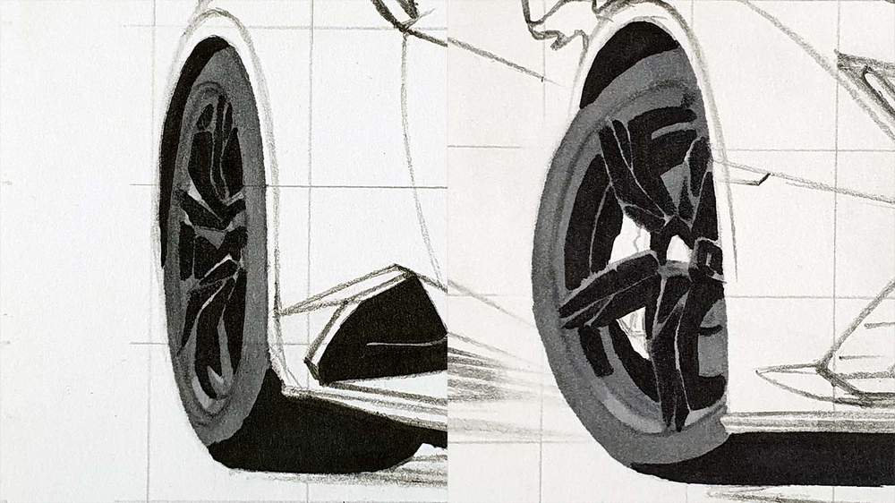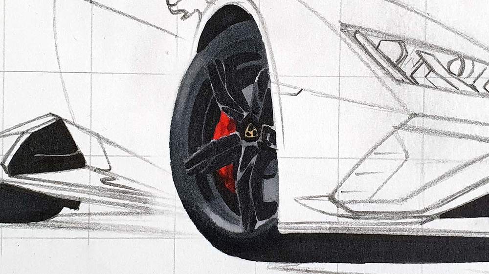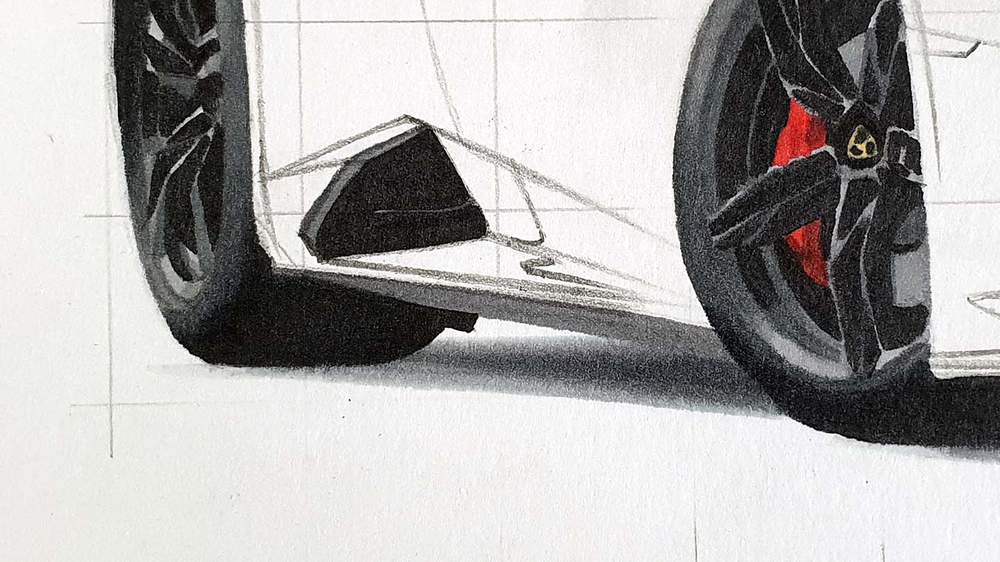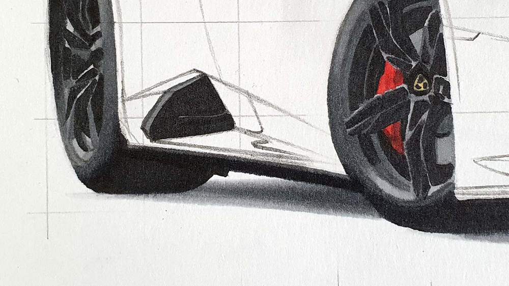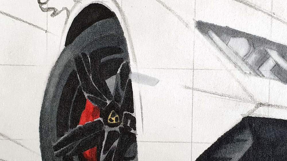 I used the Dove Grey pencil to refine the spokes of the wheels a bit more, I lightened the top left part of the tire a bit, and added the lines of the left aero piece in the front of the Huracán.